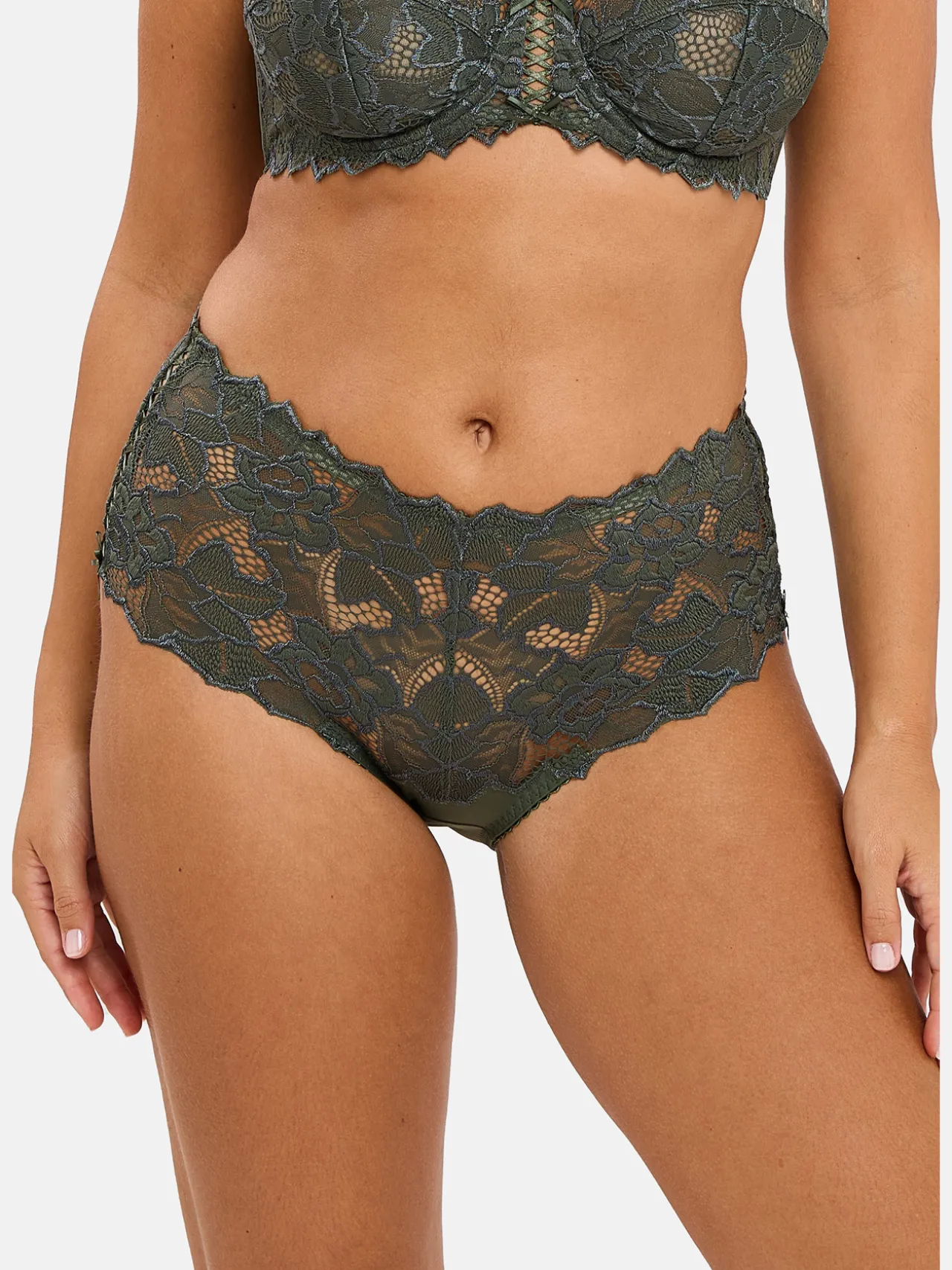– Une large bande en dentelle florale textronic extensible aux finitions écailles recouvre les hanches à l’avant comme à l’arrière