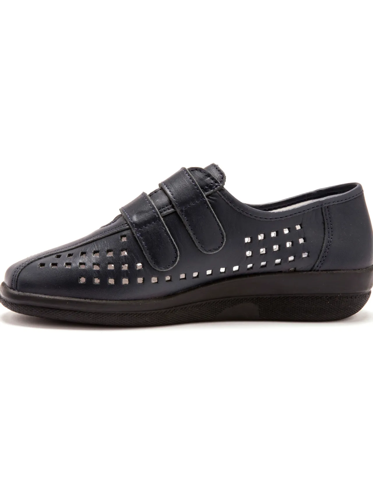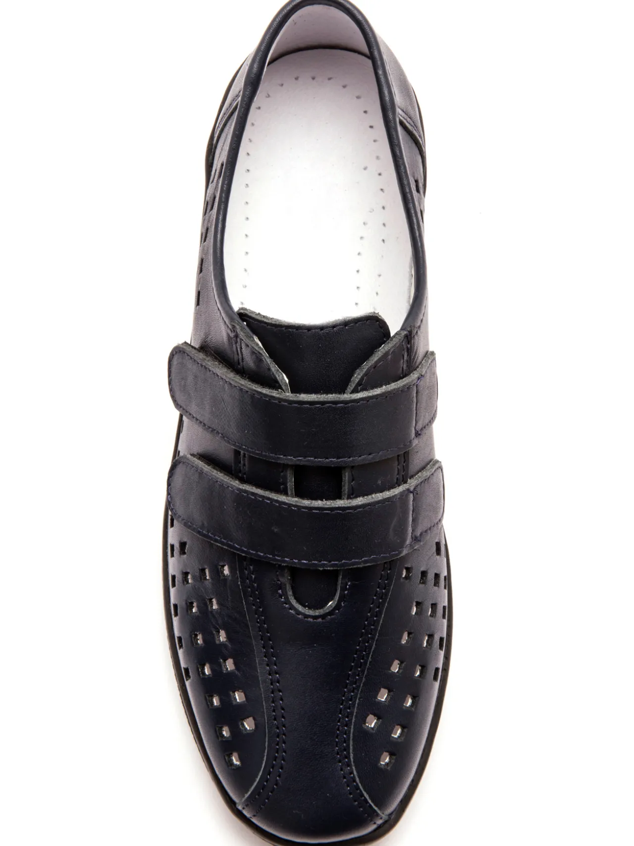 Dessus : cuir pleine fleur avec perforations fantaisie. Fermeture par double patte auto-agrippante (large ouverture et ajustement sur mesure au cou-de-pied). Doublure : synthétique. Semelle intérieure : cuir sur mousse, amovible pour y glisser notre propre semelle. Semelle : polyuréthane ultra légère.