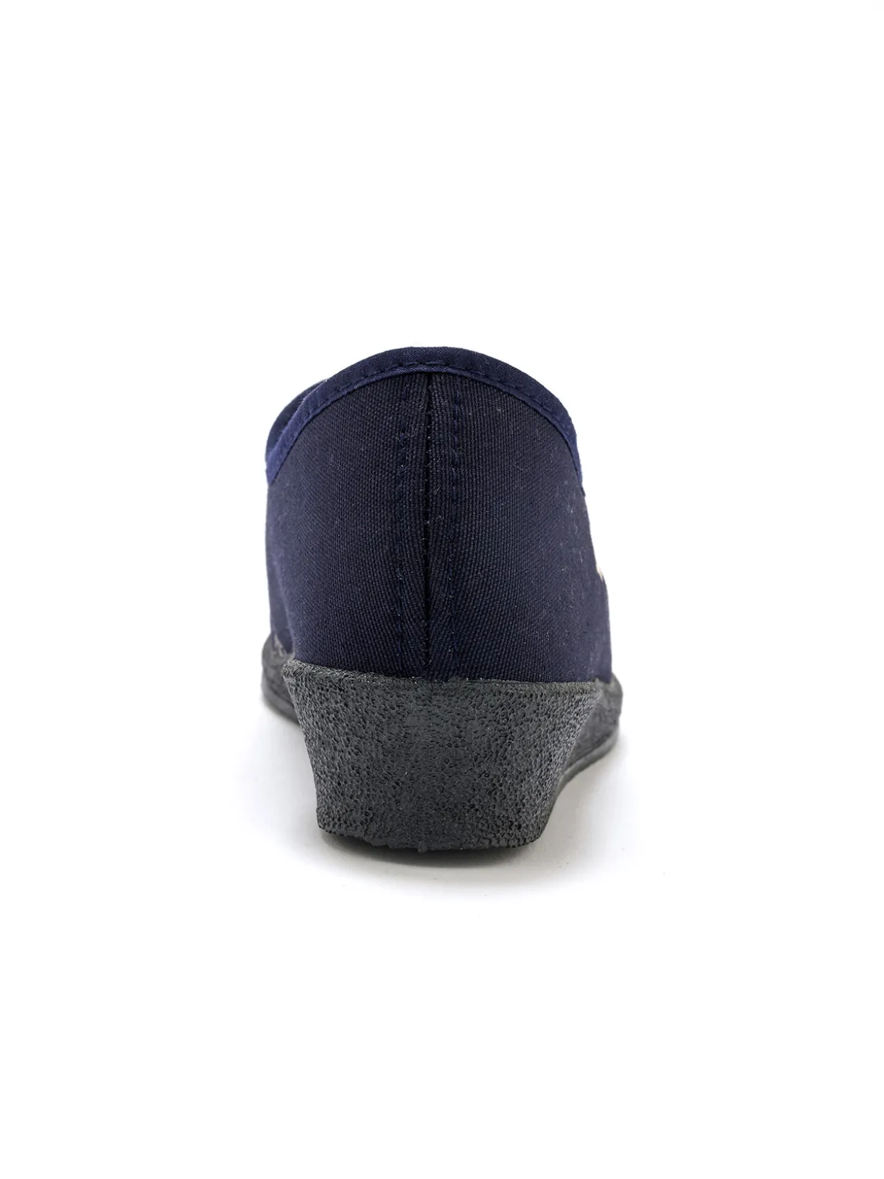 Dessus : toile pur coton. Broderie, bel effet de matelassage apporté par des surpiqûres contrastantes de chaque côté de l’empeigne, finition biais ton sur ton. Doublure et semelle intérieure : éponge sur mousse. Semelle : élastomère compensée.