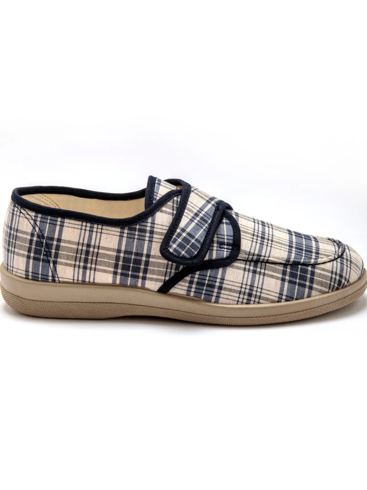 Dessus en textile aspect lin. Doublure et semelle intérieure éponge. Finition biais très soignée. Semelle élastomère.