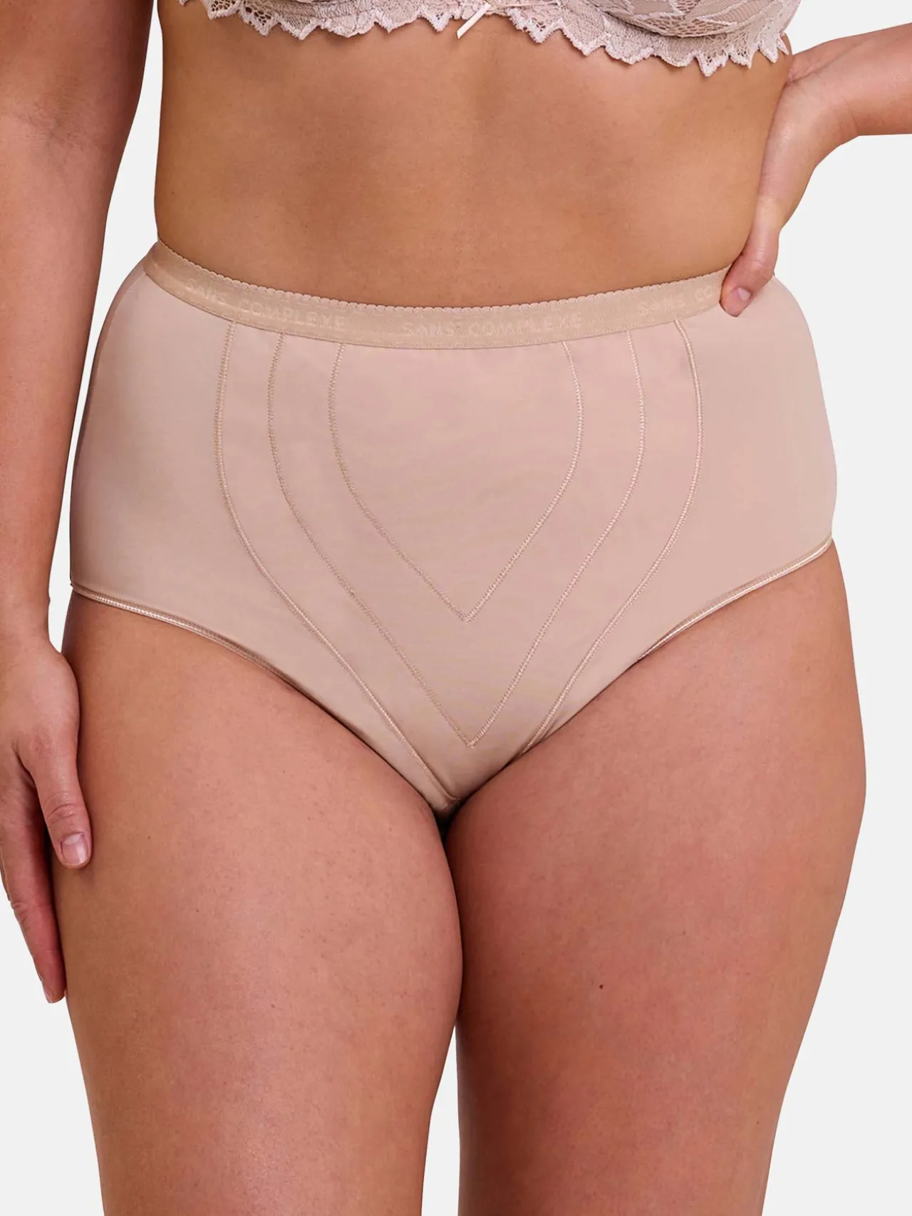 Culotte gainante à taille haute élastiquée avec plastron ventral doublé coton.