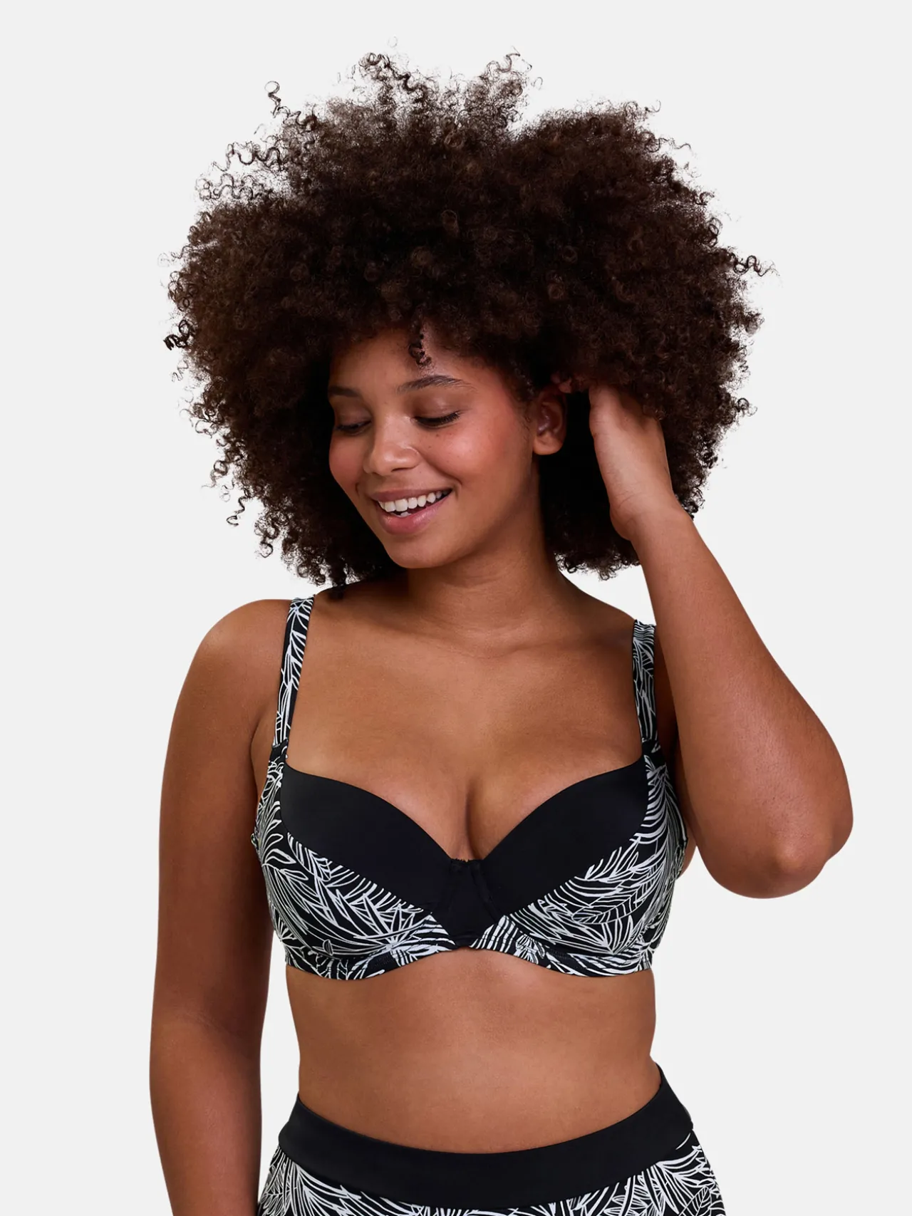 Ce haut de maillot de bain SANS COMPLEXE adopte une forme moderne et féminine par son imprimé graphique mixé à de l’uni noir.