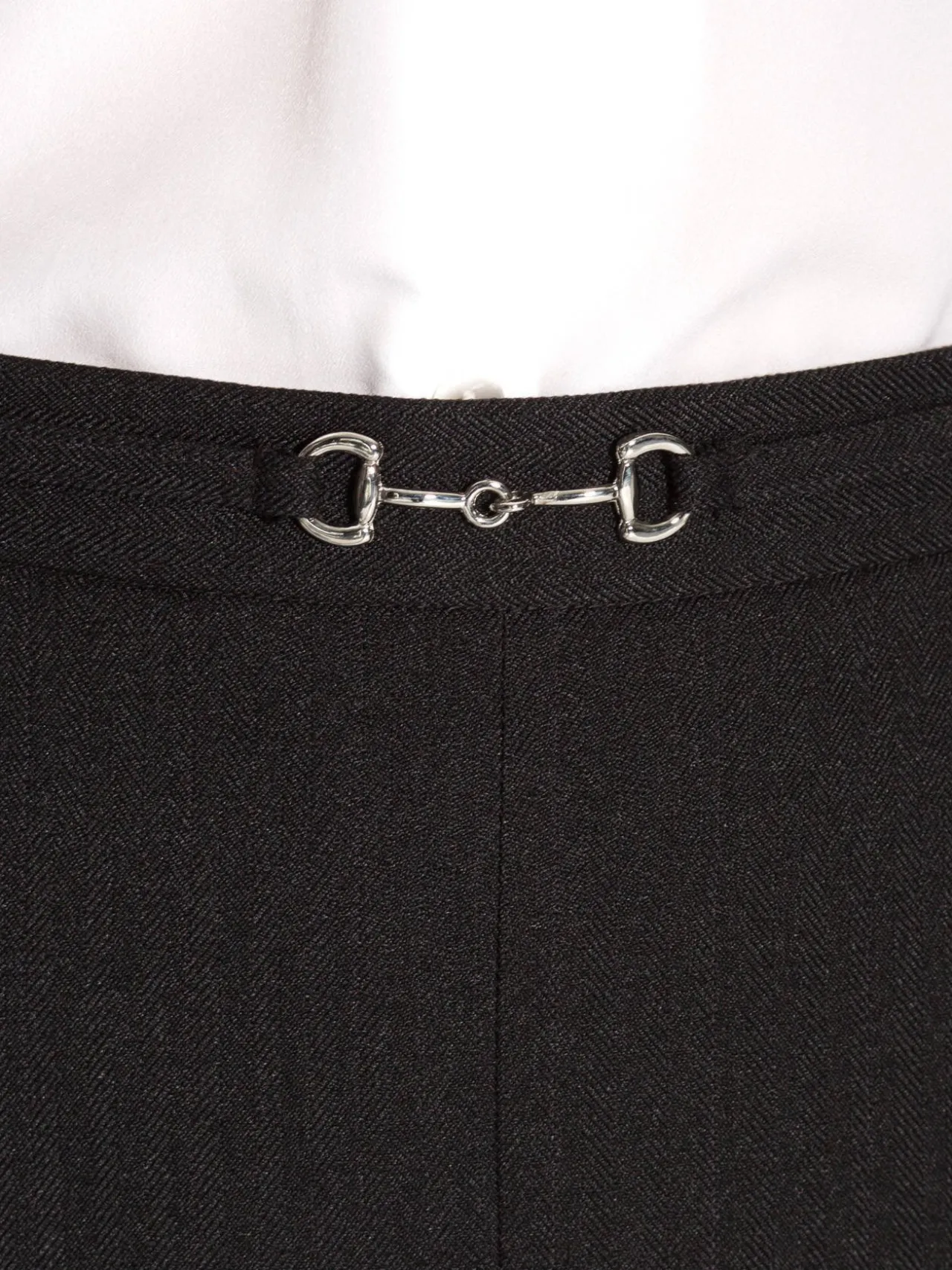 Ceinture rehaussée d’une bride fantaisie, élastiquée côtés dos et fermée par bouton et glissière invisible au dos.