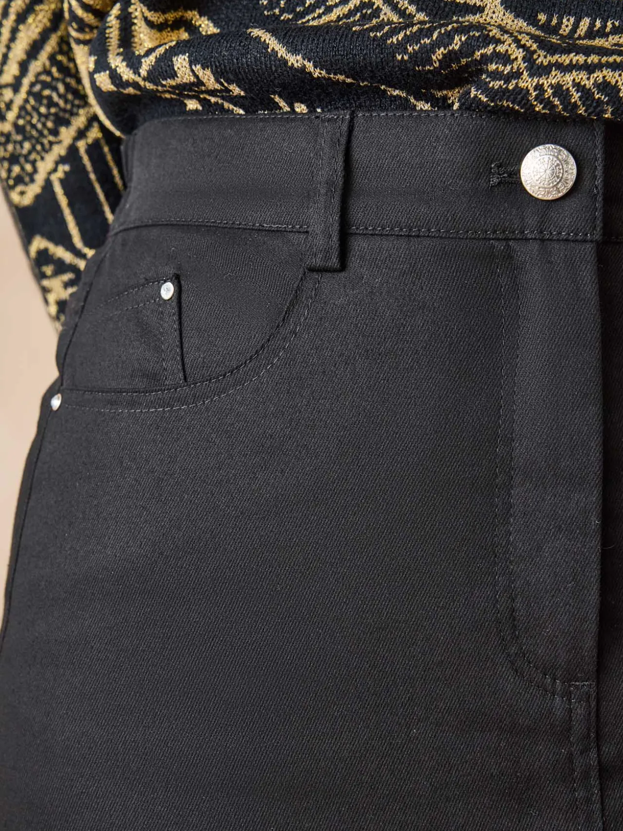 – Poches cavalières et 1 fausse poche ticket devant, poches plaquées dos, avec strass fantaisie