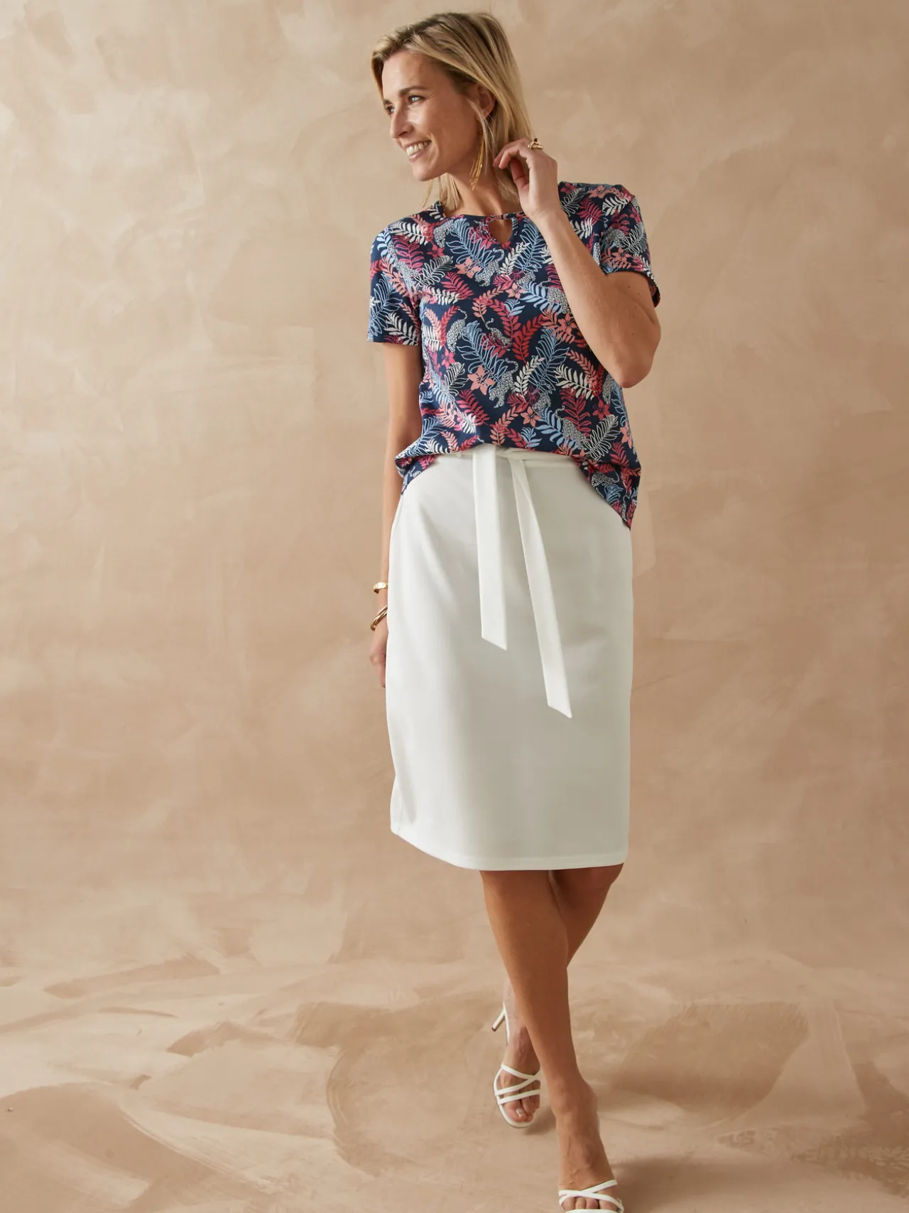 Sous la ceinture à large passants de cette jupe unie se cache une taille élastiquée… un bon compromis entre style et confort !