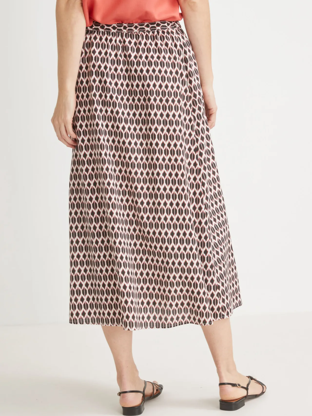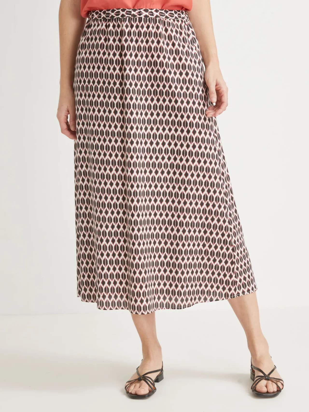 Une jupe fluide, facile à vivre, : vite lavée, vite séchée ! Avec sa ceinture entièrement élastiquée, cette jupe d’été marque joliment la taille mais sans serrer.