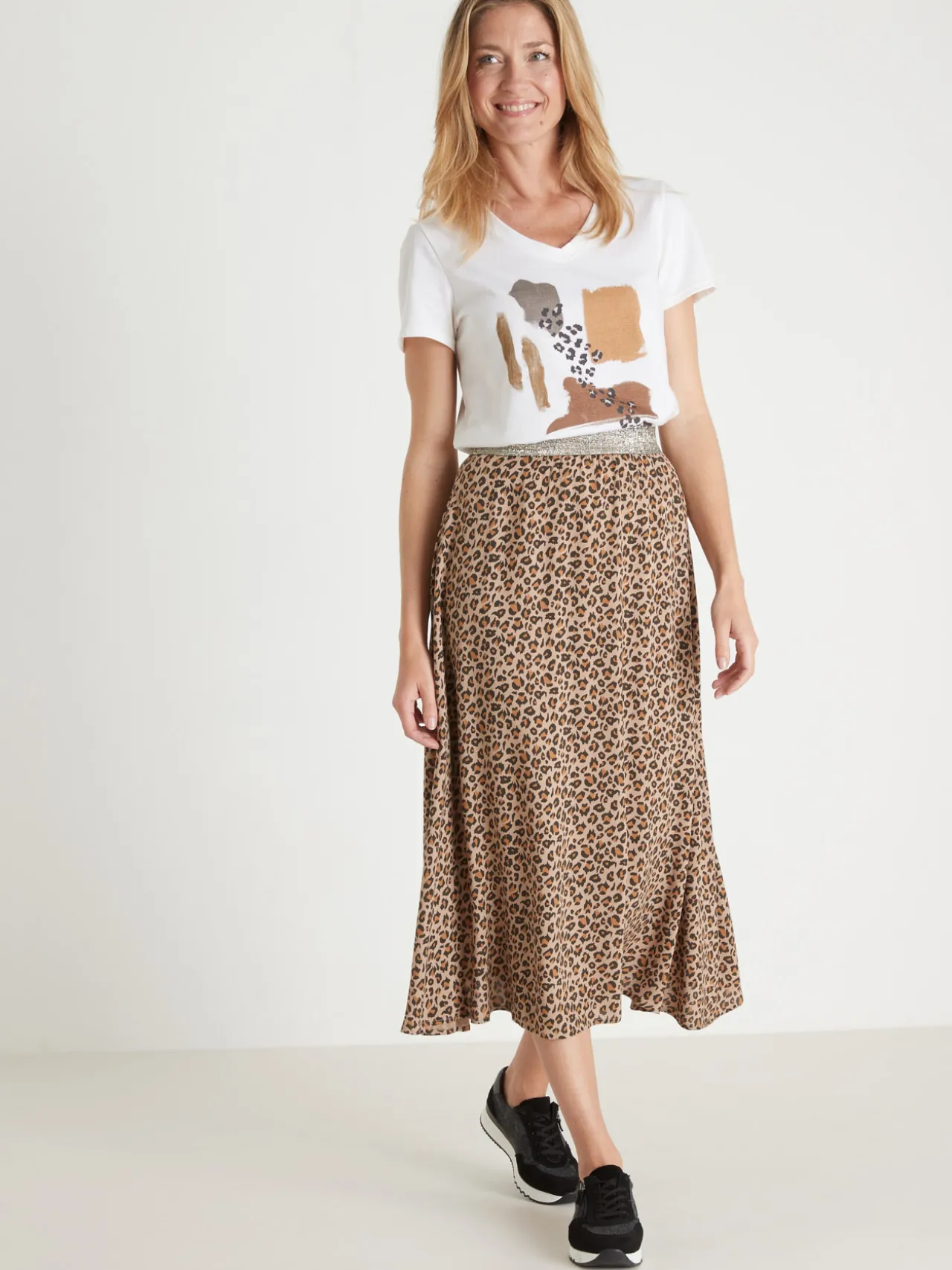 Cette jupe imprimée est conçue pour toutes les morphologies : petites et grandes tailles.