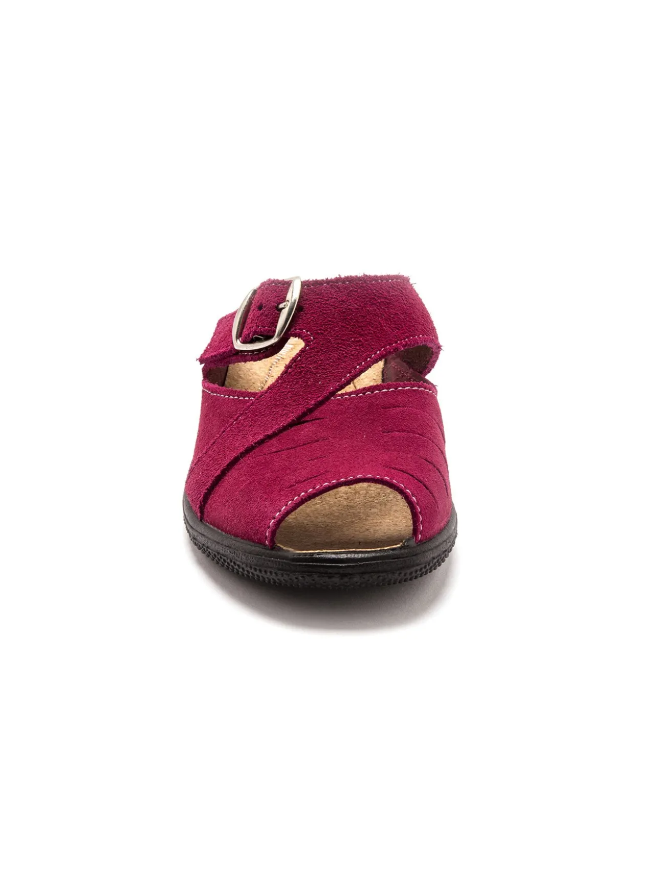 Dessus : cuir velours. Fermeture par large boucle réglable. Non doublées. Semelle intérieure : liège, doux et sain. Semelle : élastomère.