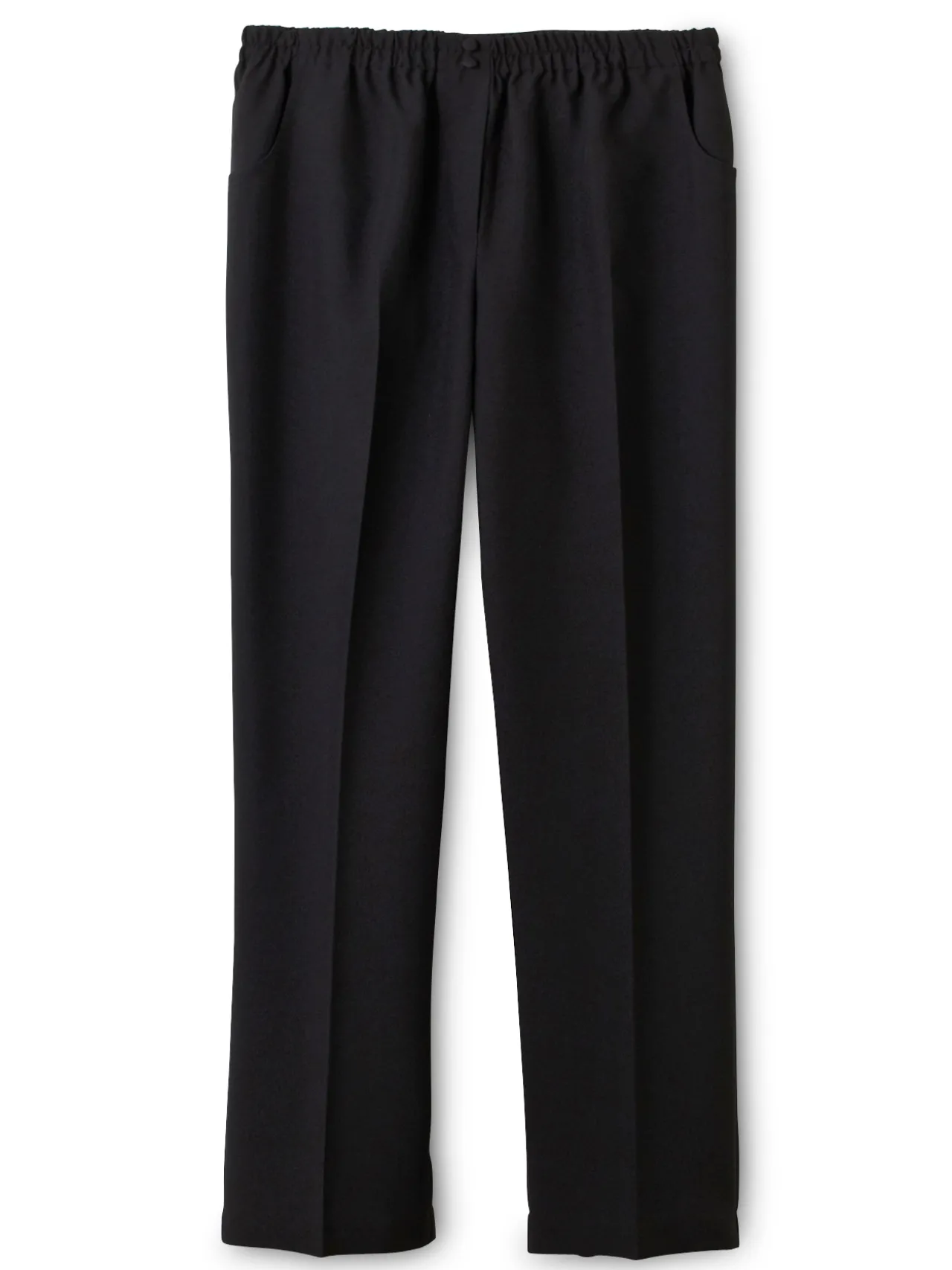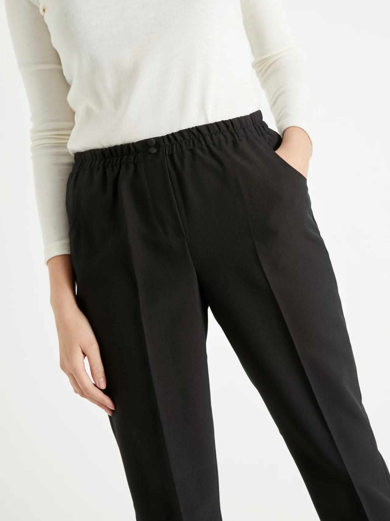 Ceinture entièrement élastiquée, de 2 petits boutons recouverts. 2 poches arrondies. Plis permanents.