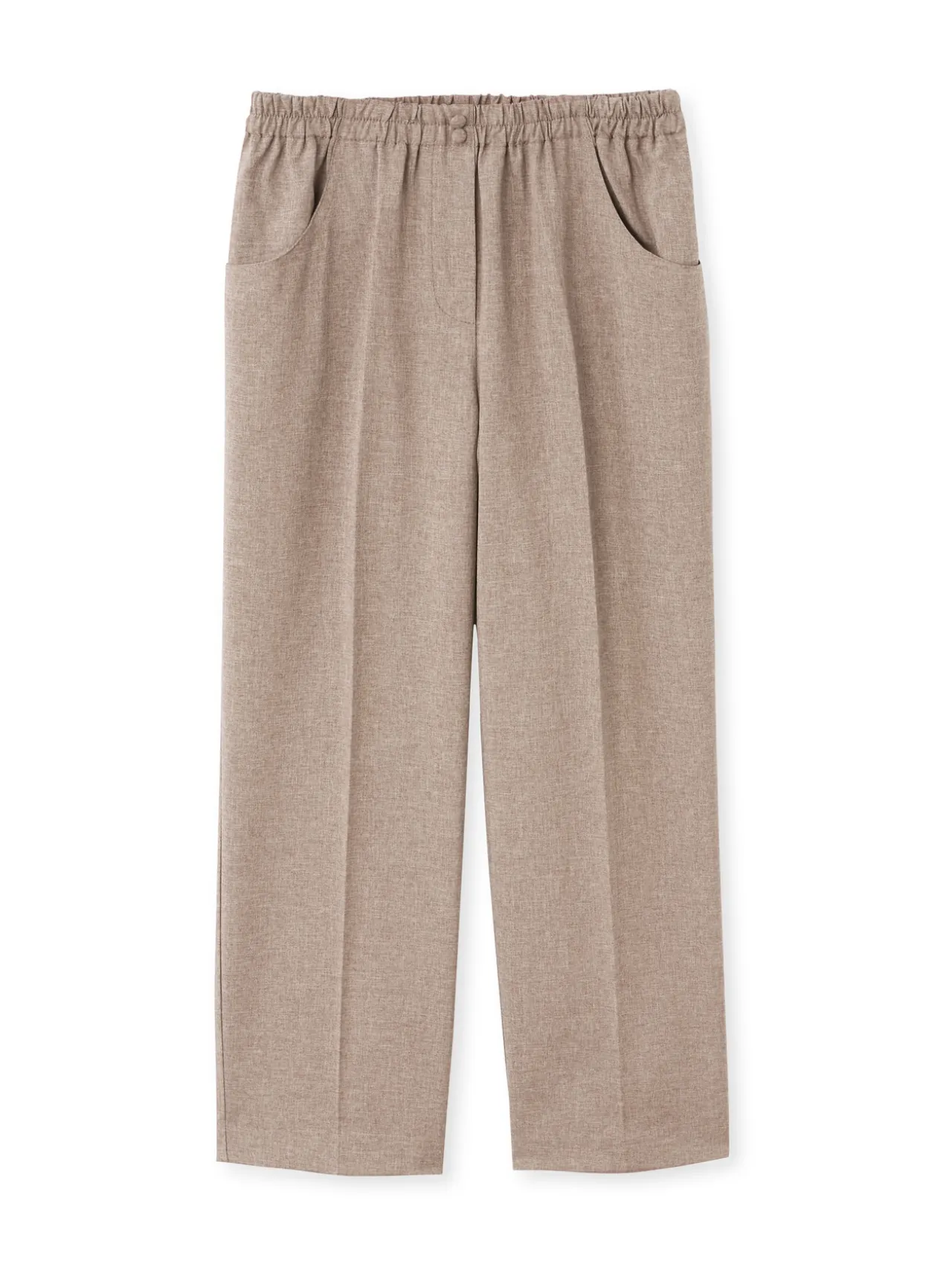 Ceinture entièrement élastiquée, de 2 petits boutons recouverts. 2 poches arrondies. Plis permanents.