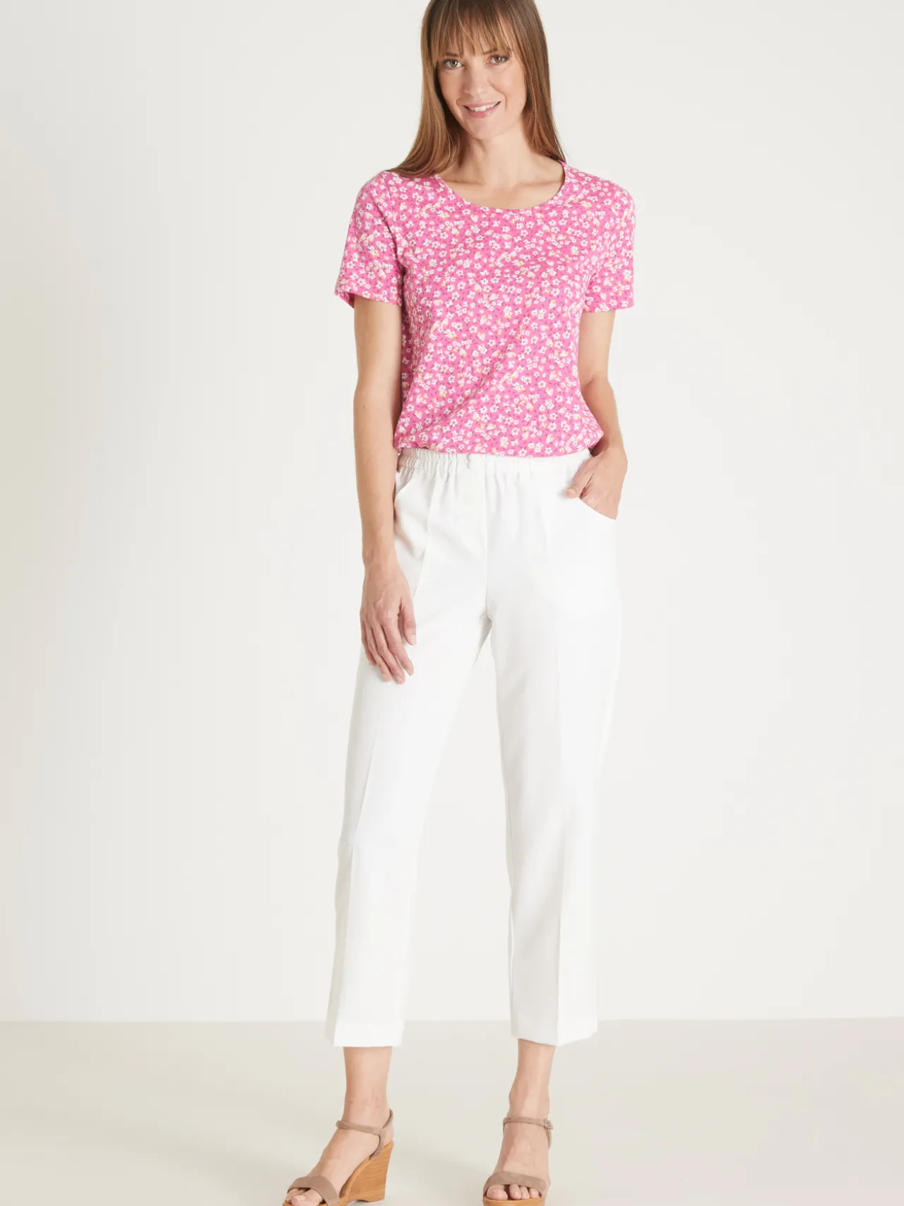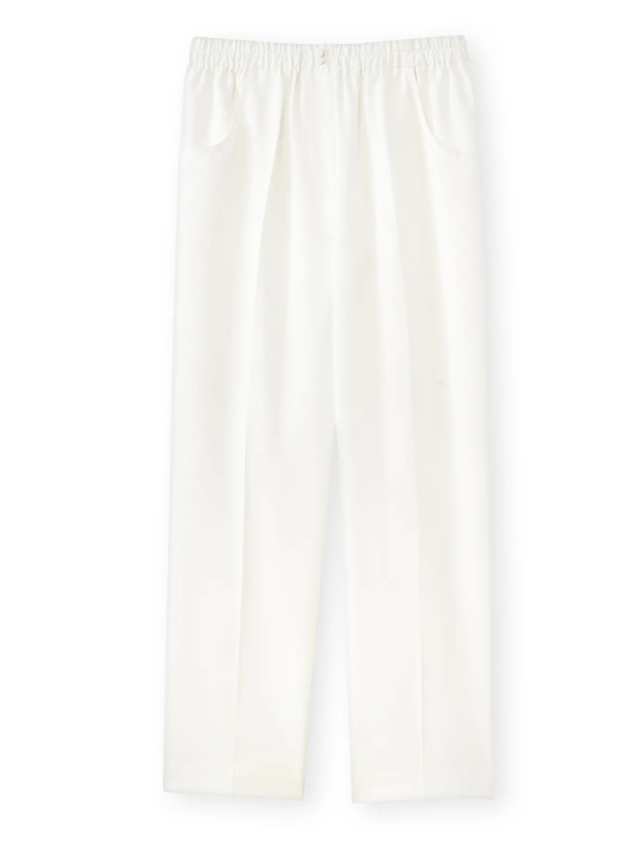 Ceinture entièrement élastiquée, de 2 petits boutons recouverts. 2 poches arrondies. Plis permanents.
