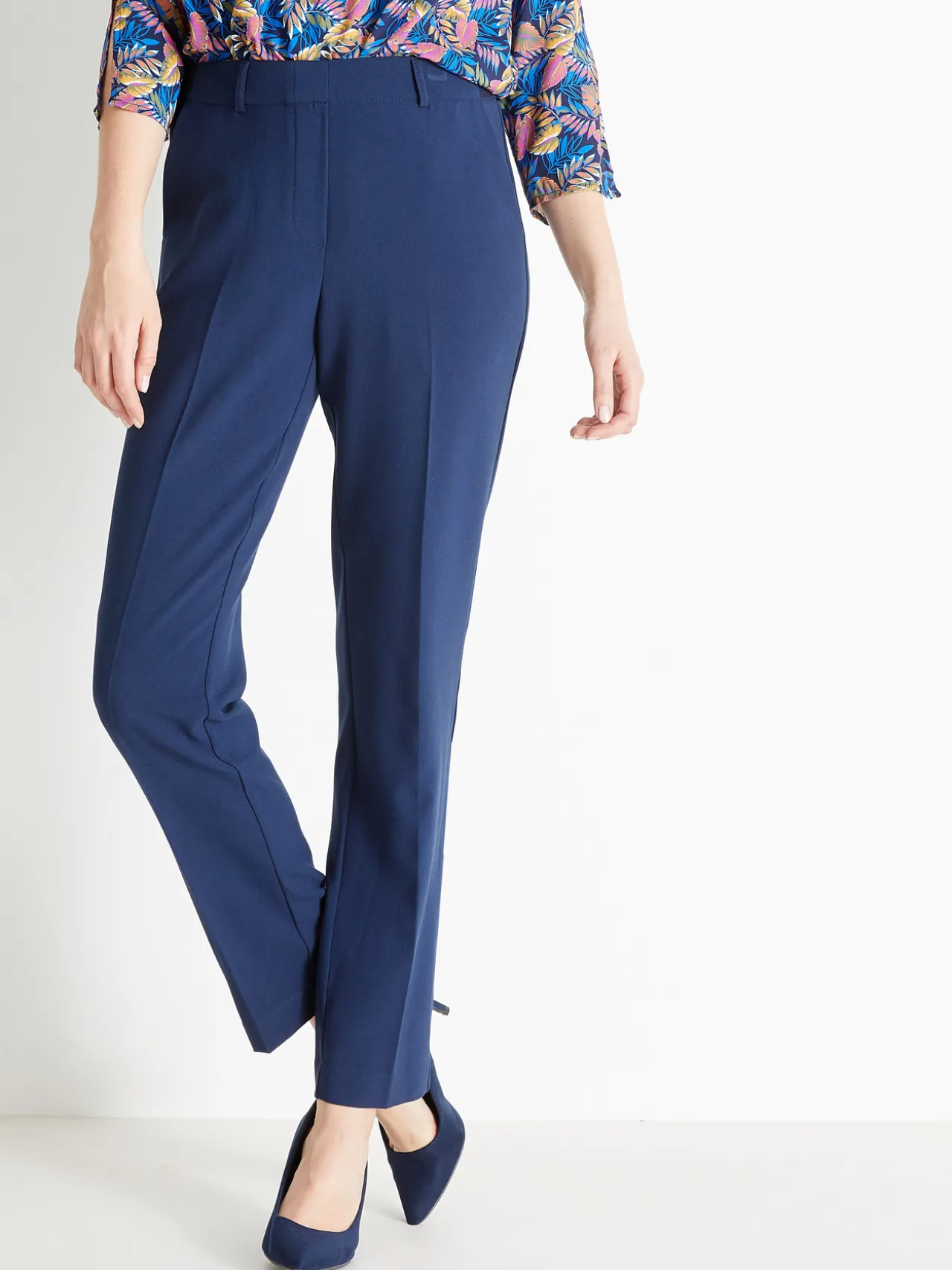 Ceinture droite entièrement élastiquée : élastique plat sous tunnel devant, apparent au dos, avec passants. Fausse braguette. 2 poches italiennes devant, 1 fausse poche passepoilée au dos. Pli permanent devant et dos.