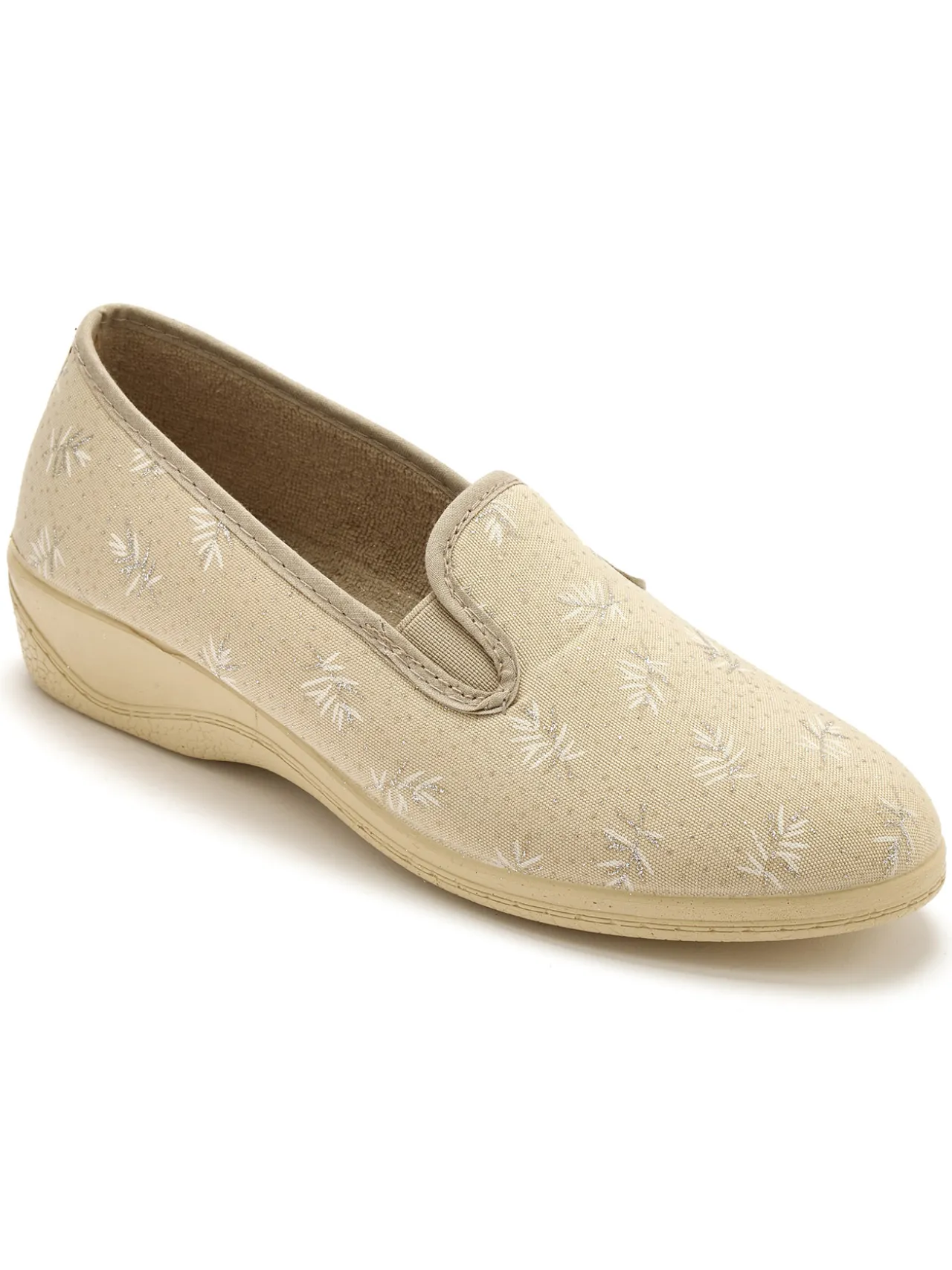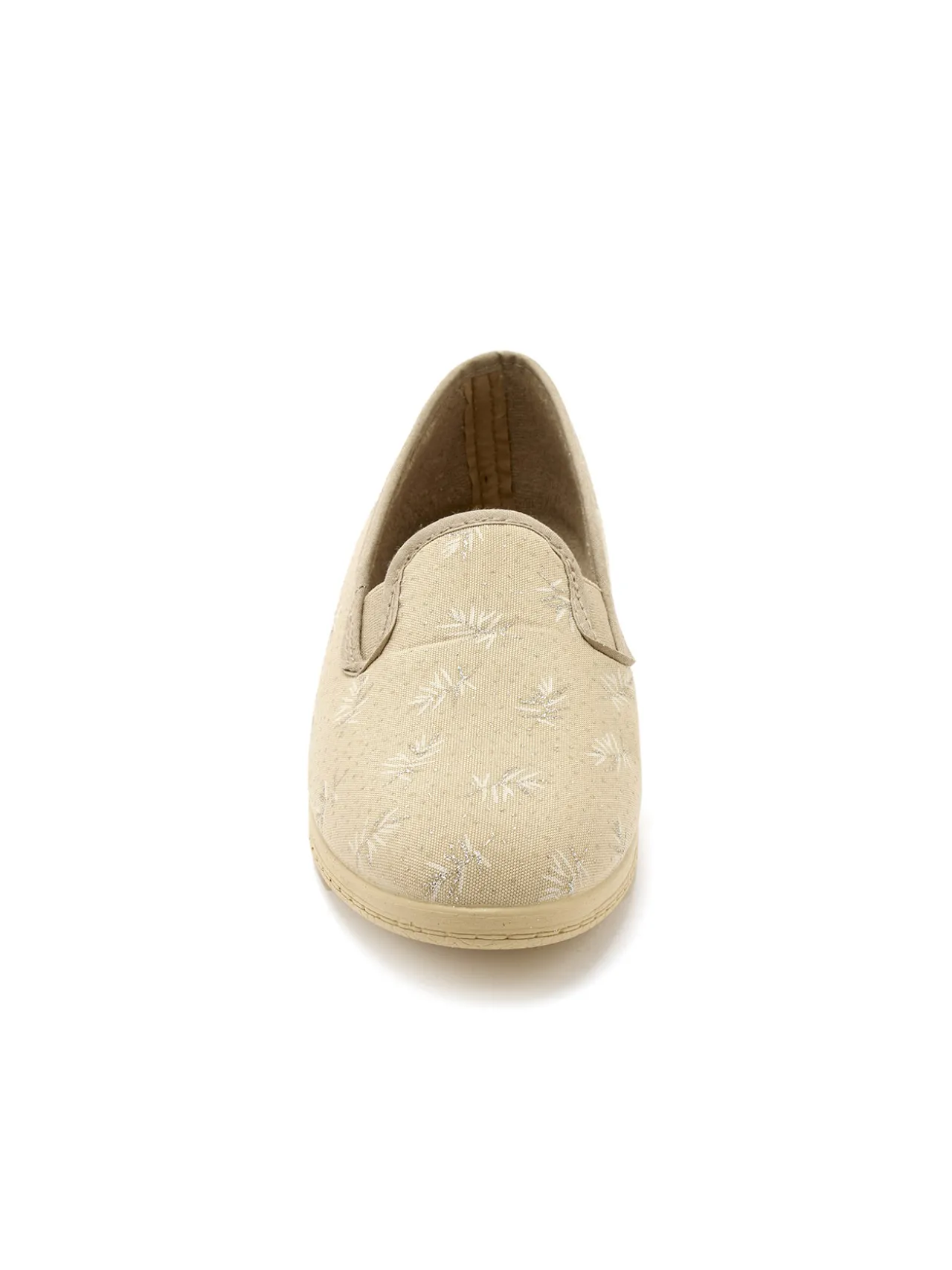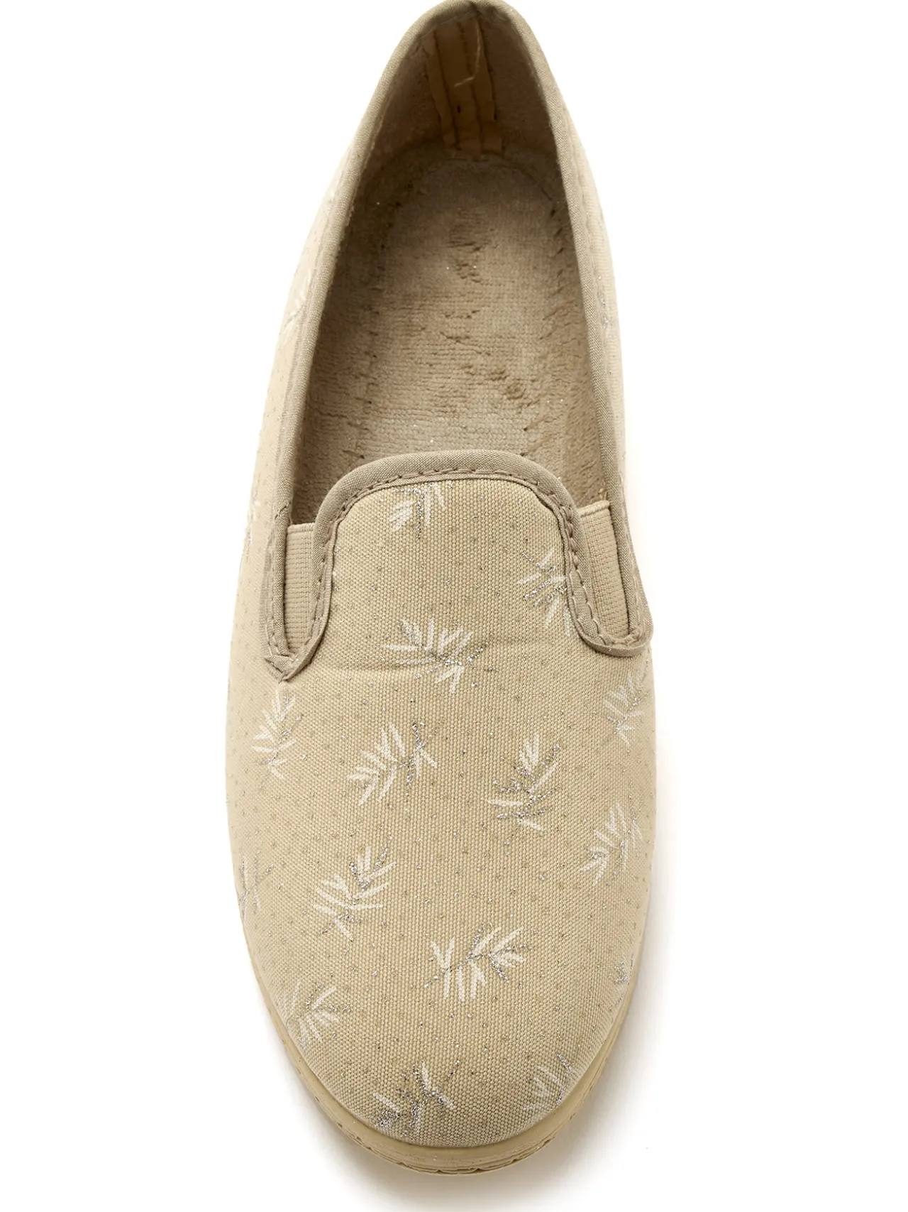 Faciles à enfiler, ces pantoufles sans-gêne grâce à leurs élastiques côtés. Leur dessus textile est personnalisé par un joli imprimé aux motifs feuilles stylisées.