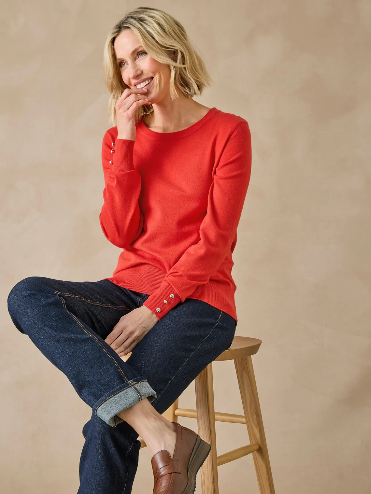 Le pull uni col rond est une valeur sûre du dressing. De jolis boutons-bijoux au bas des manches lui apportent du chic et de l’élégance ! Il vous sera facile d’associer ce pull classique à tous vos pantalons et jupes.