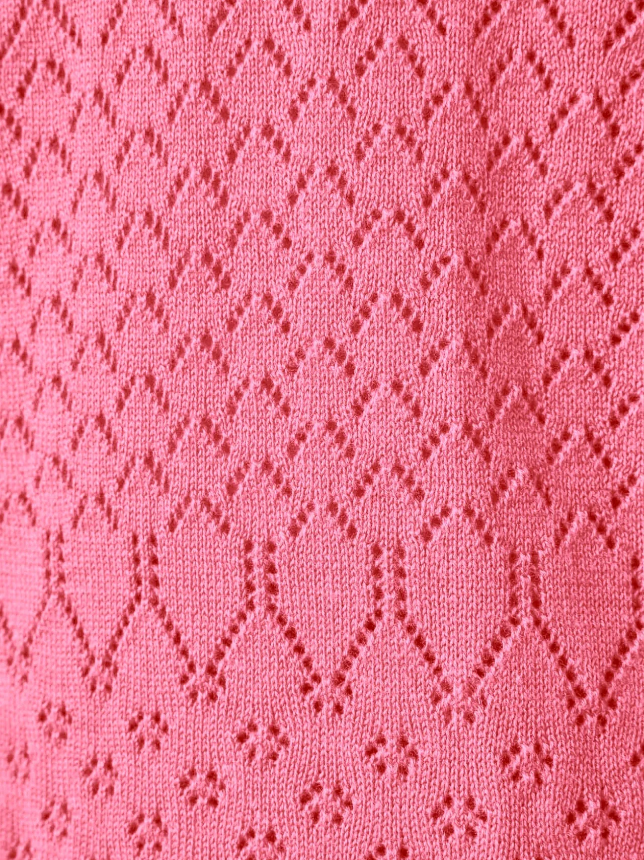 Encolure ronde. Jeu d’ajourés et de points fantaisie. Emmanchures semi-diminuées. Jolies manches au coude froncées. Finitions bords-côtes.