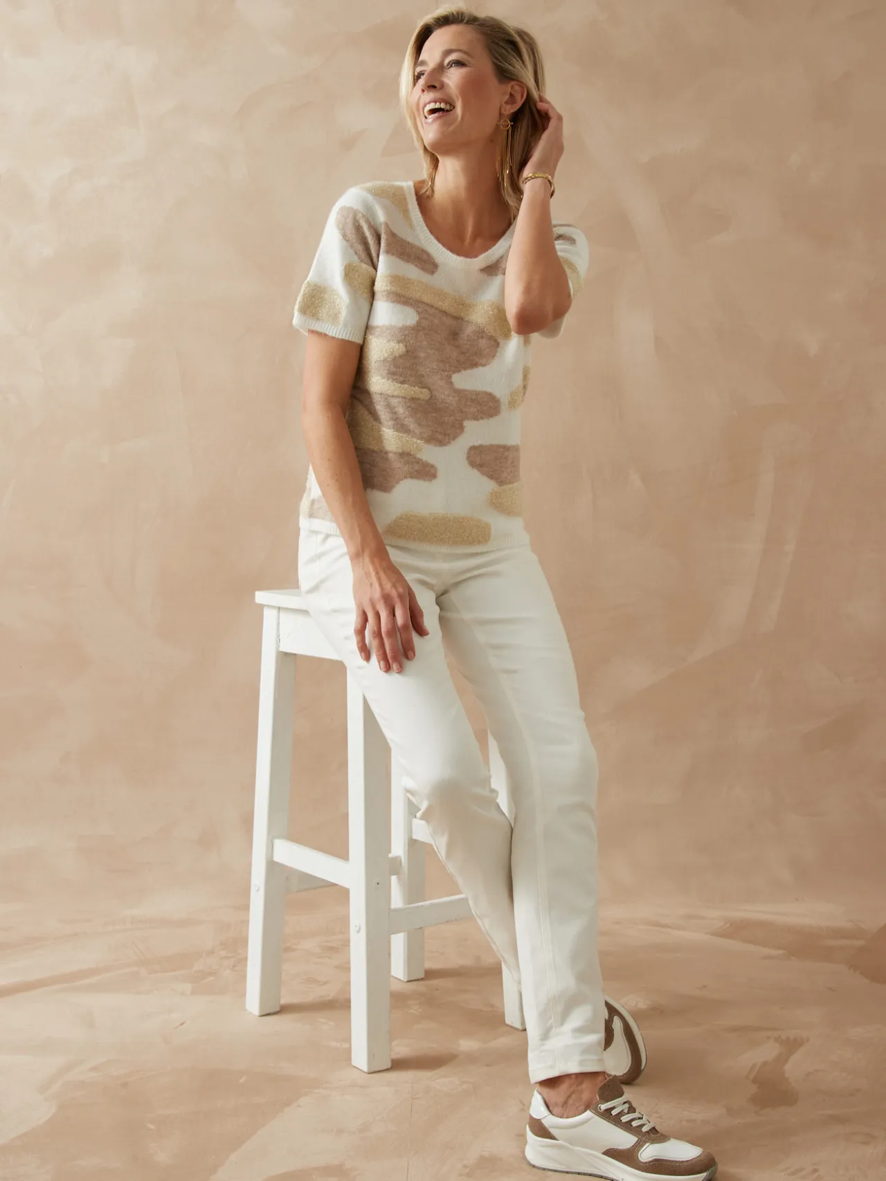 De jolies vagues dessinent un motif jacquard intarsia sur ce pull manches courtes. Sa maille est parcourue d’un fil légèrement brillant, ce qui lui donne encore plus de caractère.