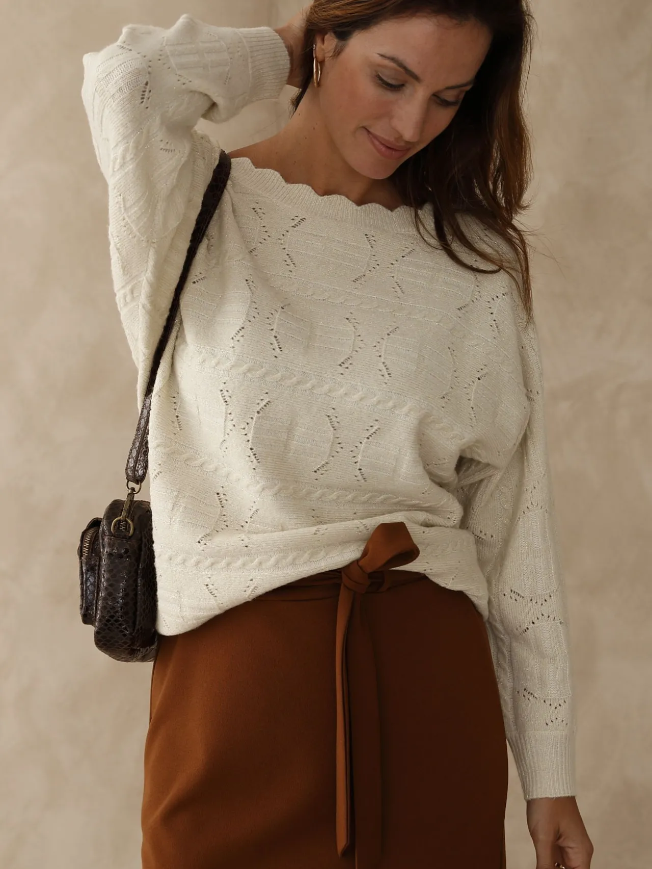 La maille fantaisie et l’encolure soulignée d’une finition écailles font tout le charme de ce pull manches longues, facile à associer à tous vos pantalons et jupes. Enrichi de laine, il vous tient bien chaud !