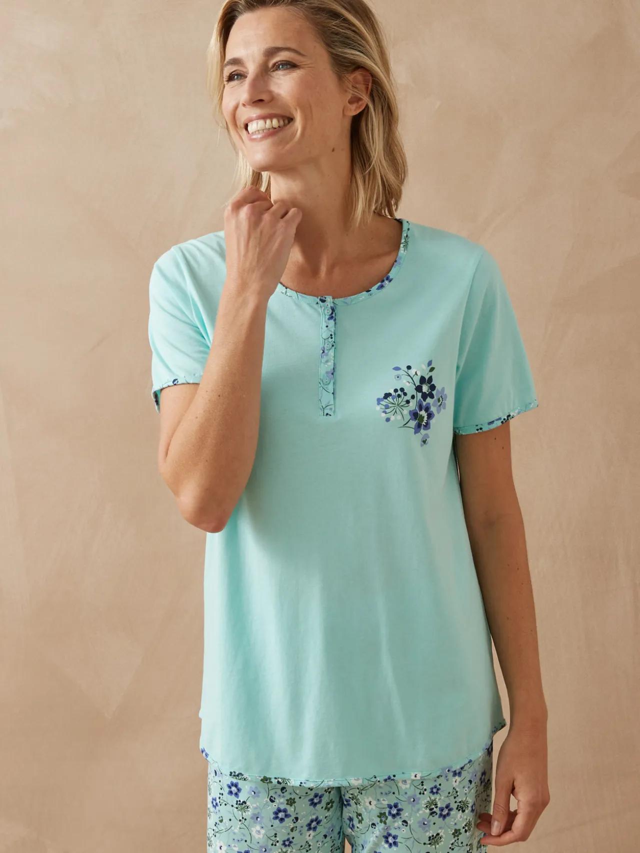 Un pyjacourt sous le signe de la douceur grâce à une maille jersey tout coton et un imprimé vert d’eau très frais. Une pièce phare de votre lingerie de nuit estivale !