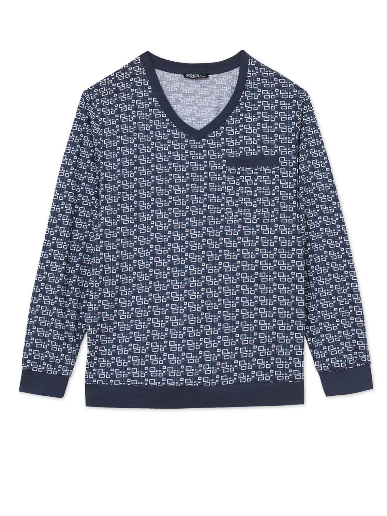 Haut : entièrement imprimé. Poche poitrine plaquée. Bord-côtes double à l’encolure V, en haut de la poche, aux manches longues et à la base. Longueur 70 cm environ.