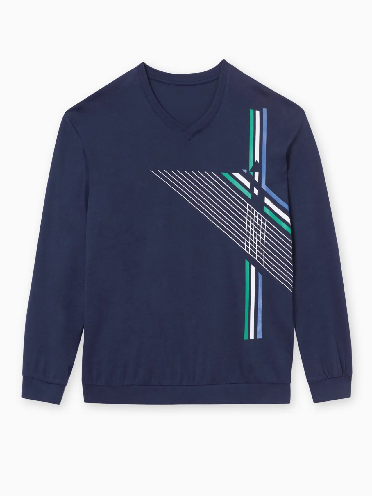 Le haut de pyjama : motif géométrique placé devant. Double bord-côtes à l’encolure V, aux poignets et à la base. Longueur 72 cm environ.