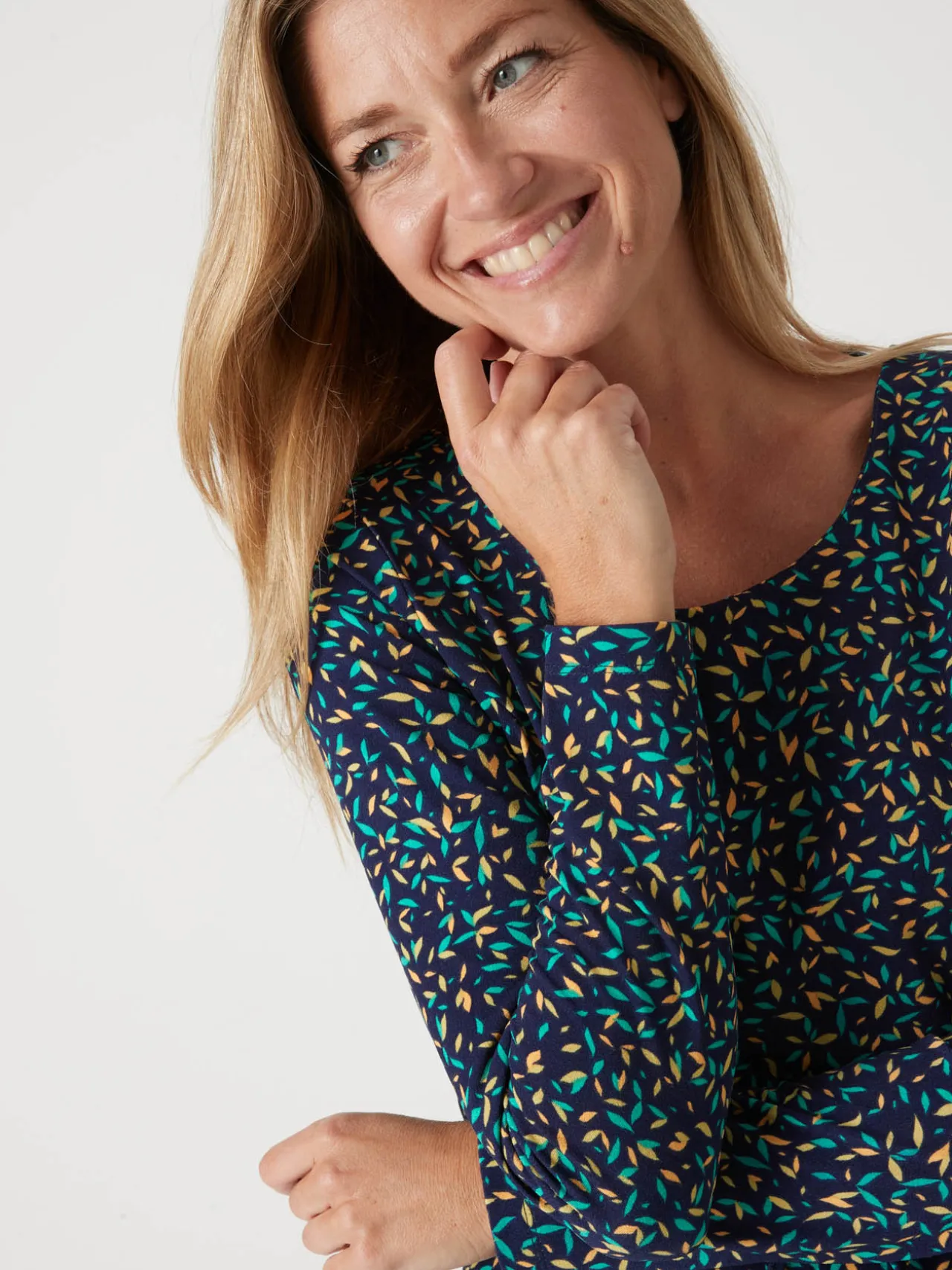 Cette robe manches longues s’habille d’un très joli imprimé et sa coupe joue, avec brio, le duo confort et style.