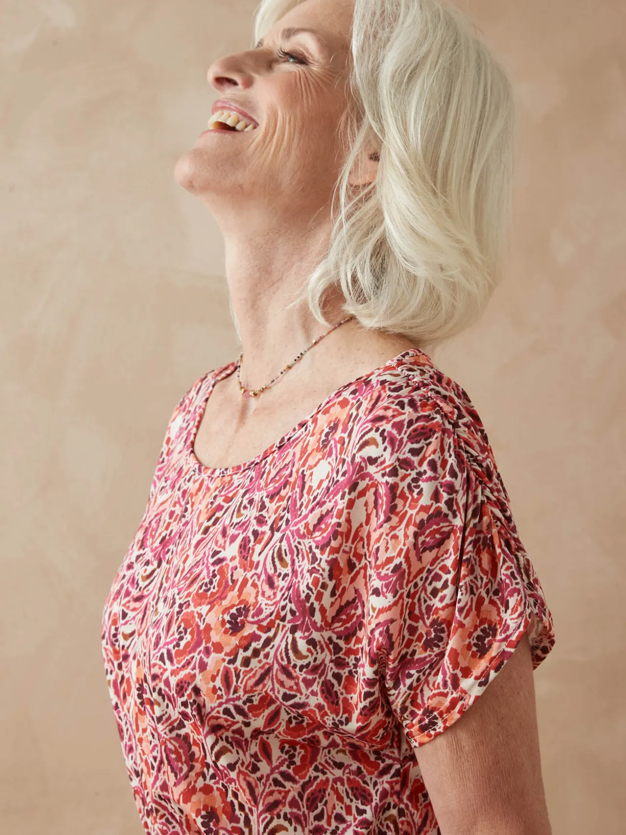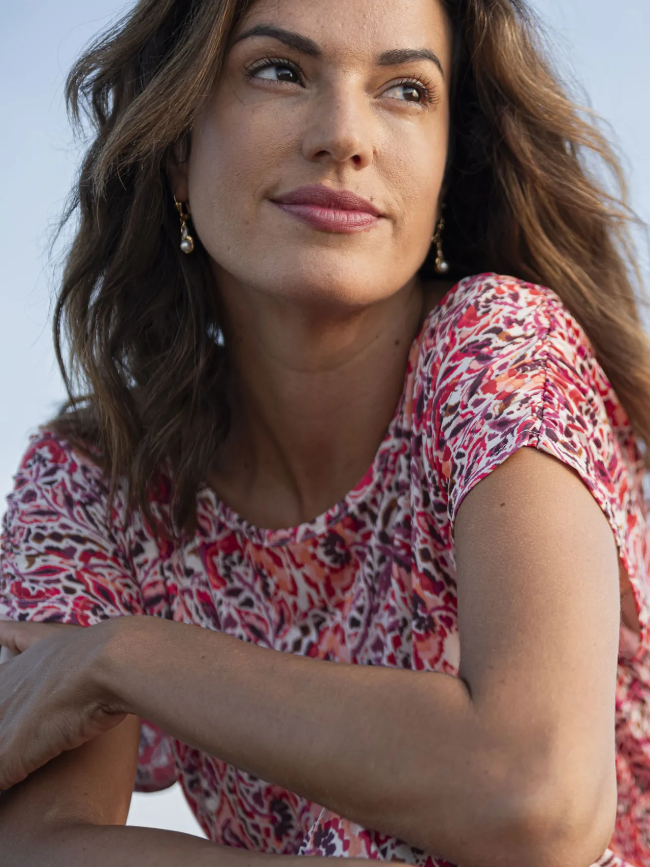 Son encolure bateau dégage le décolleté, avec beaucoup de féminité, des smocks élastiques soulignent la taille sans serrer, et ses manches T sont légèrement élastiquées et retombent joliment sur le bras.