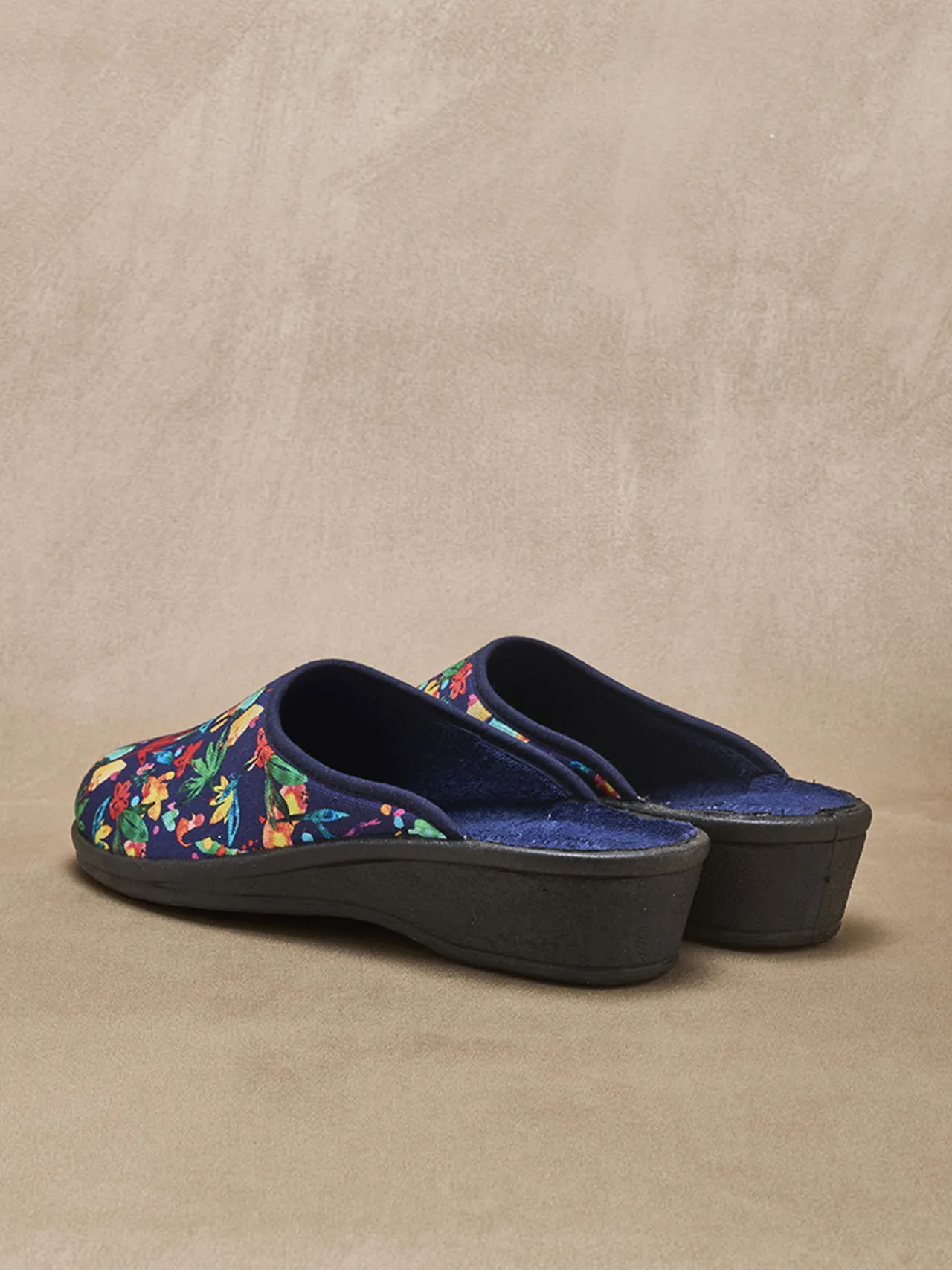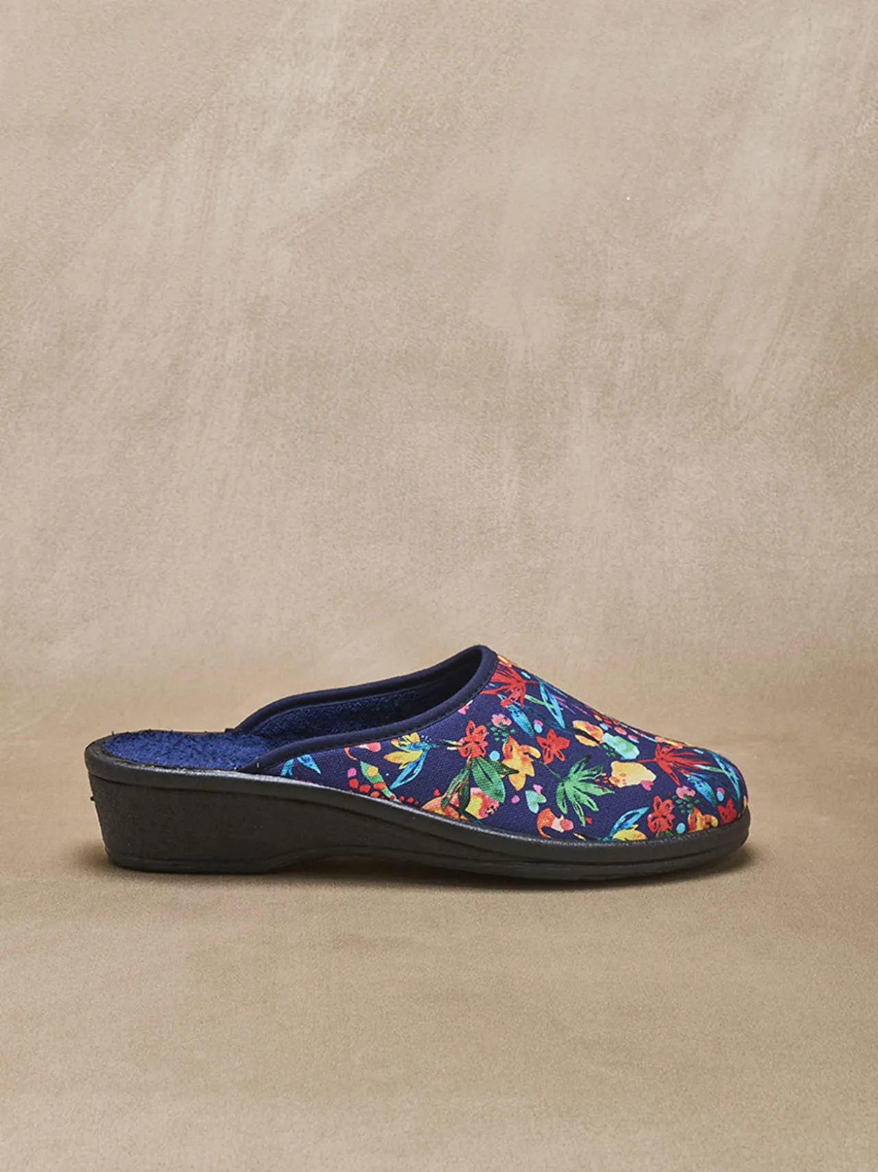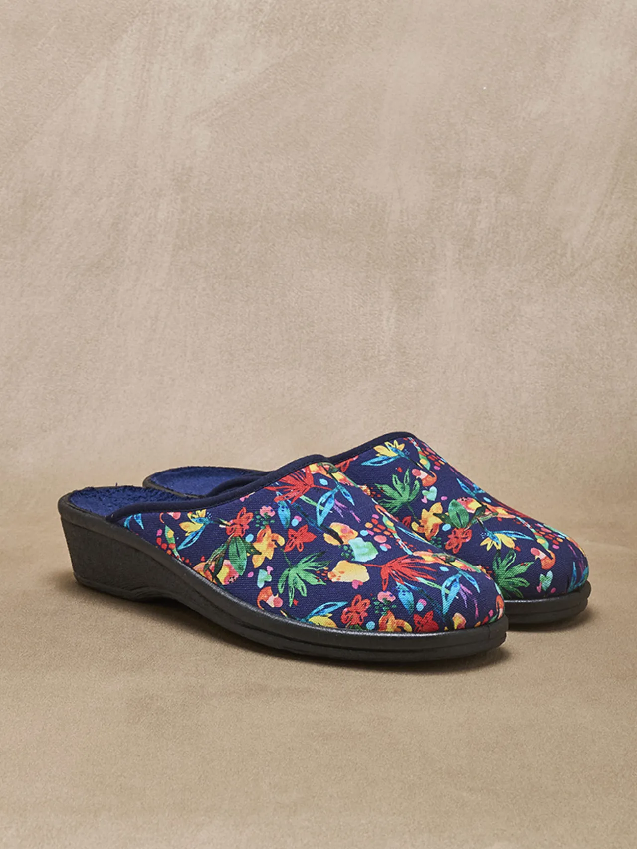 Dessus : textile. Doublure et semelle intérieure éponge. Finition biais. Semelle semi-compensée en élastomère.