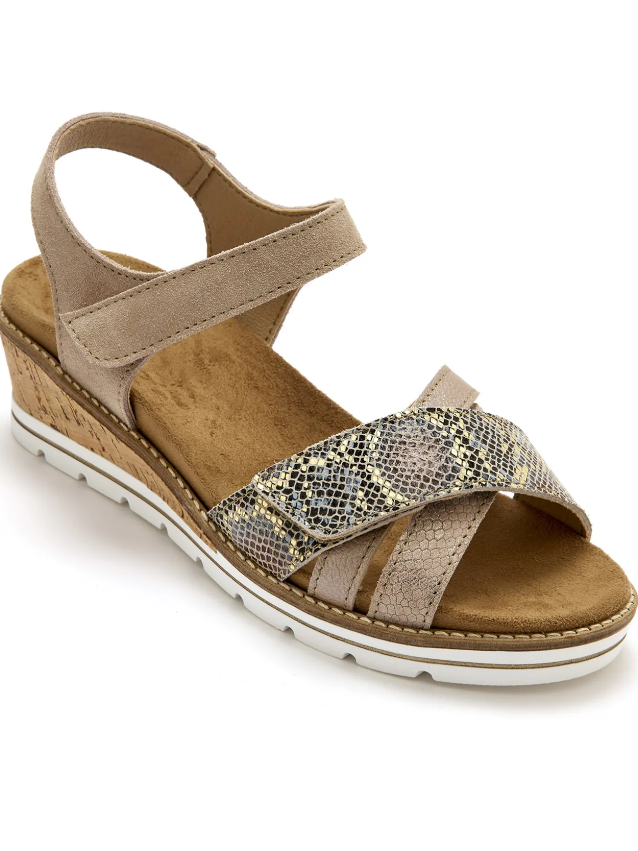 Ces sandales double scratch PEDICONFORT®, prennent un peu de hauteur, avec leur petit talon compensé, et ça nous va très bien !