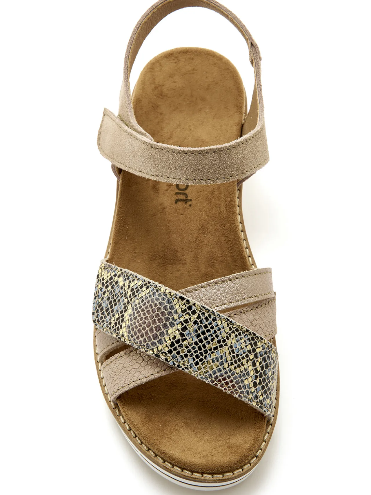 Notre modéliste a misé sur 2 pattes scratchs pour garantir aux pieds sensibles (notamment en cas d’hallux valgus), un confort idéal. L’une, à l’avant, joue la tendance d’un effet reptile, la seconde à la cheville garantit une bonne tenue de ces sandales ultra légères.