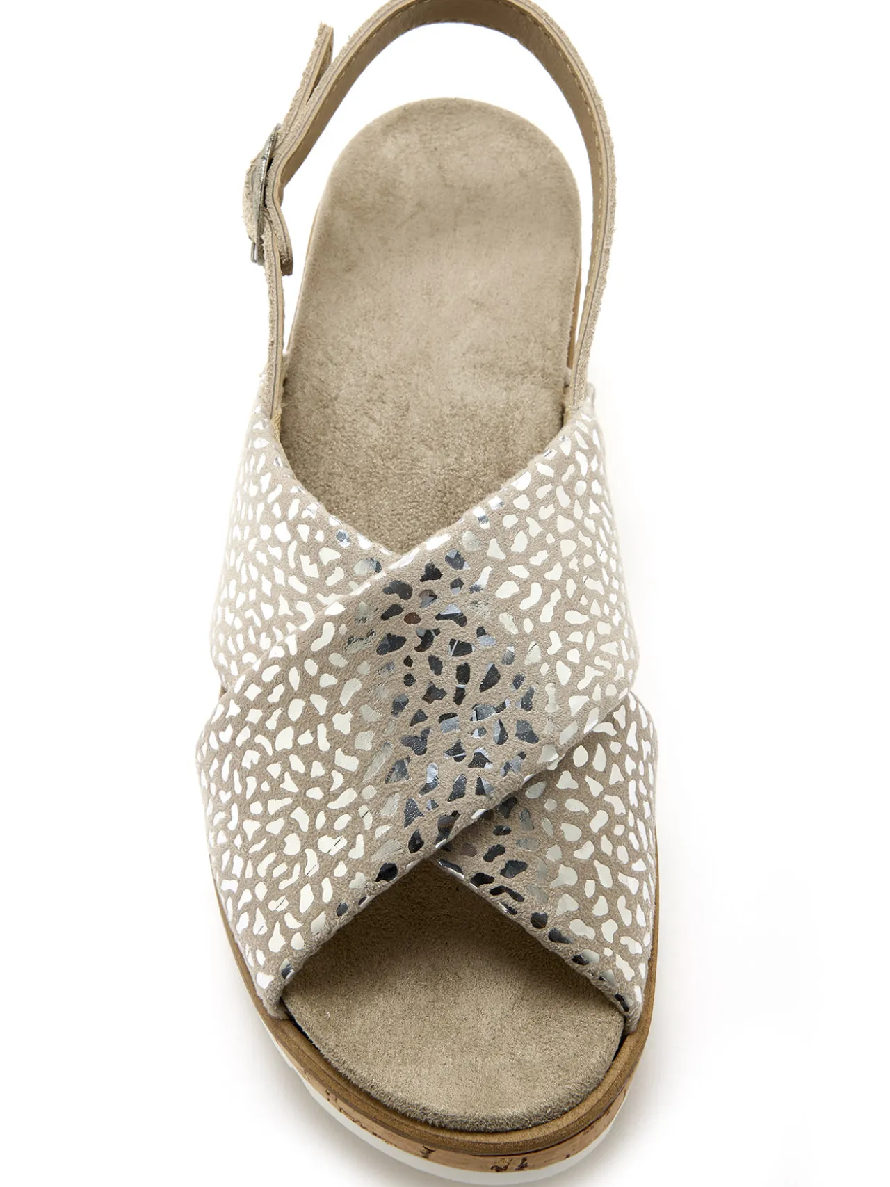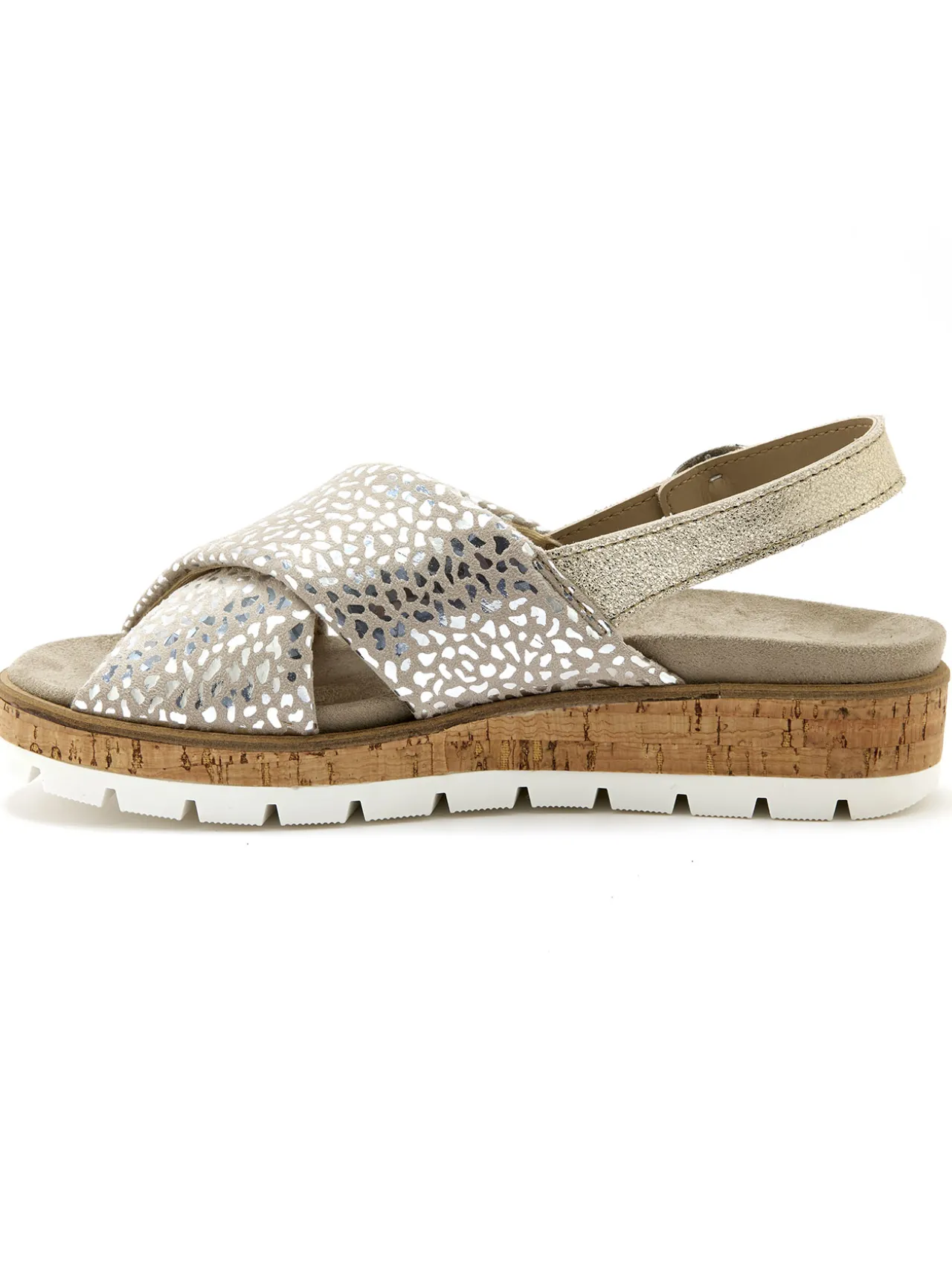 Alliance de confort et de fantaisie pour ces sandales PEDICONFORT®, grâce à leurs lanières croisées très confortables en matière extensible tubulaire, rehaussées de petits motifs brillants.
