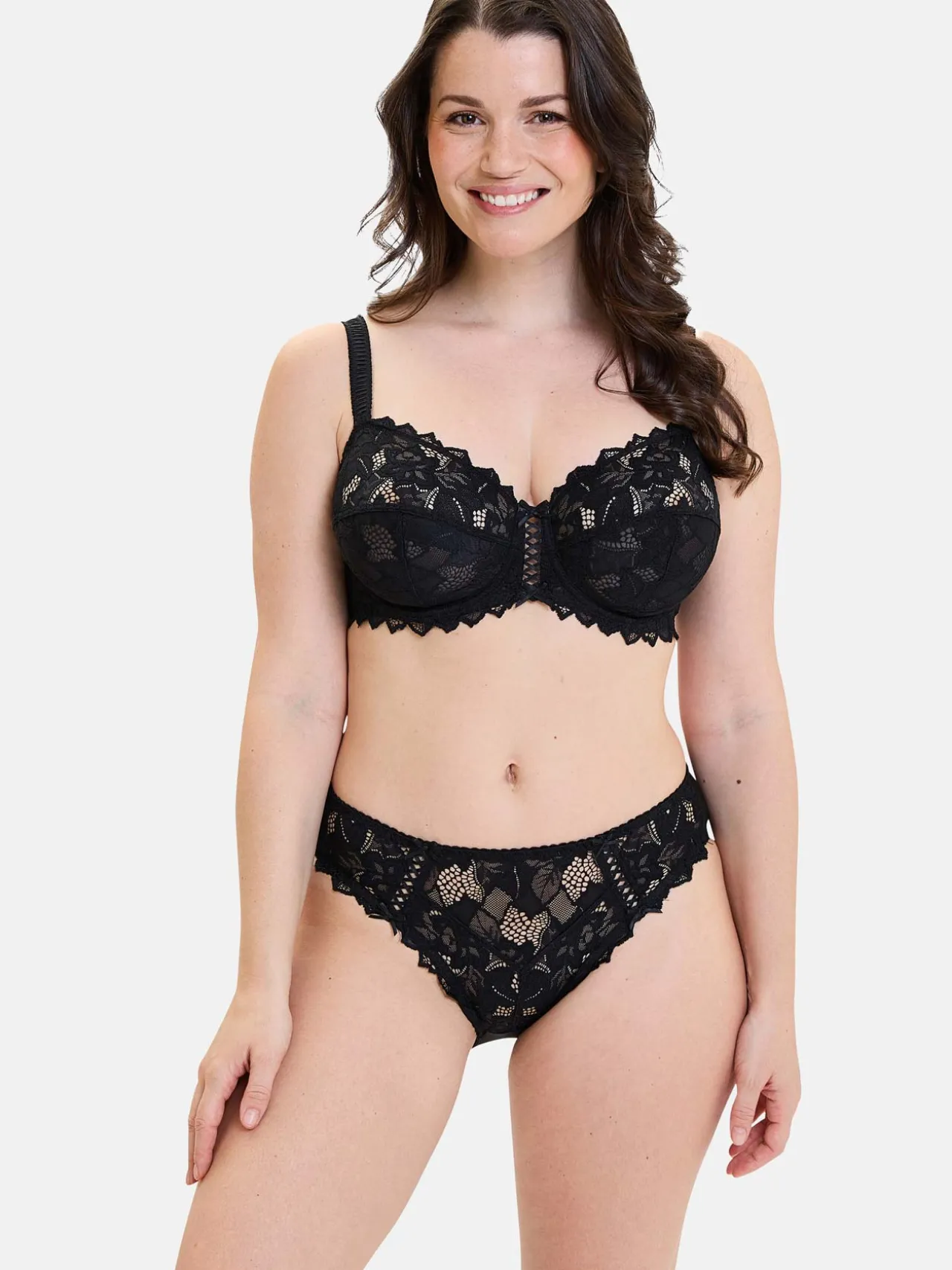 Dentelle 92% polyamide, 8% élasthanne. Tissu 83% polyamide, 17% élasthanne. Doublure fond 100% coton.