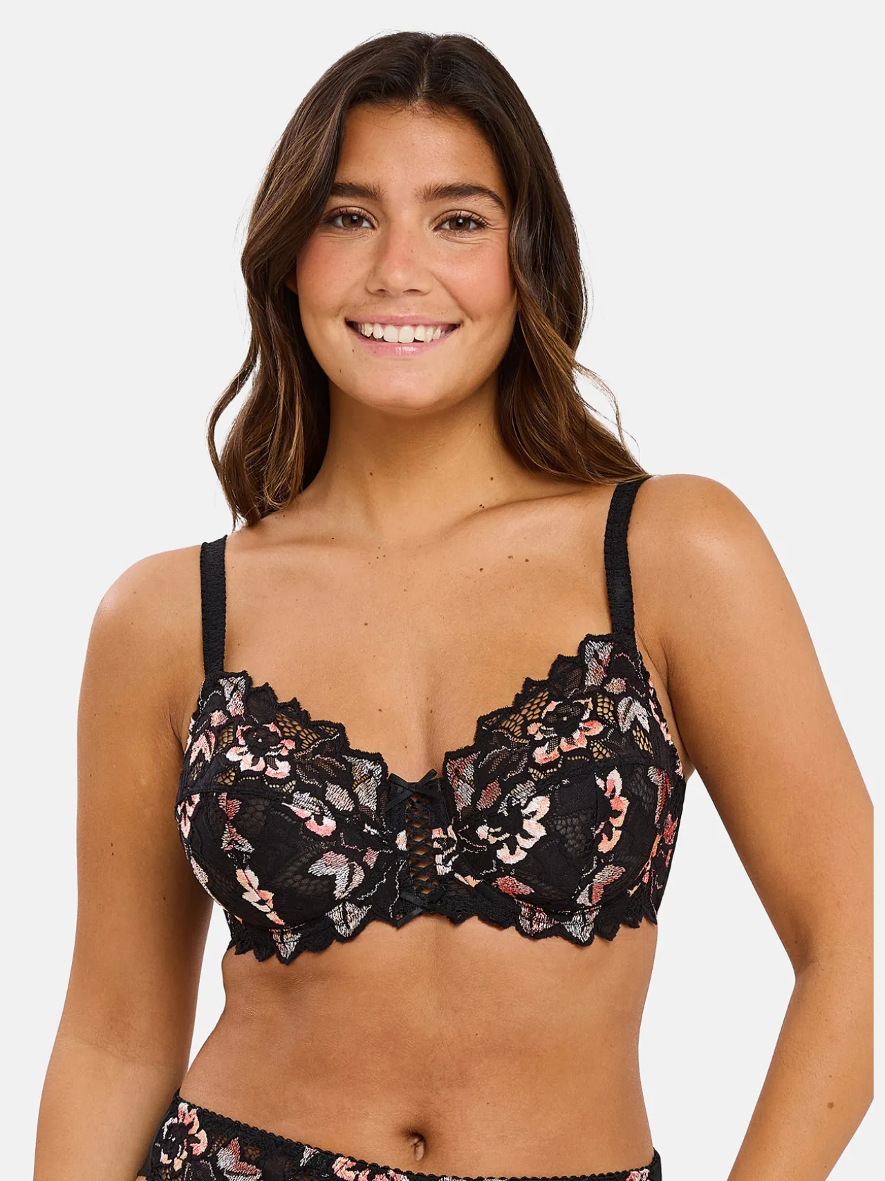 Dentelle 77% polyamide, 15% polyester, 8% élasthanne. Tissu 83% polyamide, 17% élasthanne. Doublure dos 89% polyamide, 11% élasthanne. Doublure 100% polyamide.