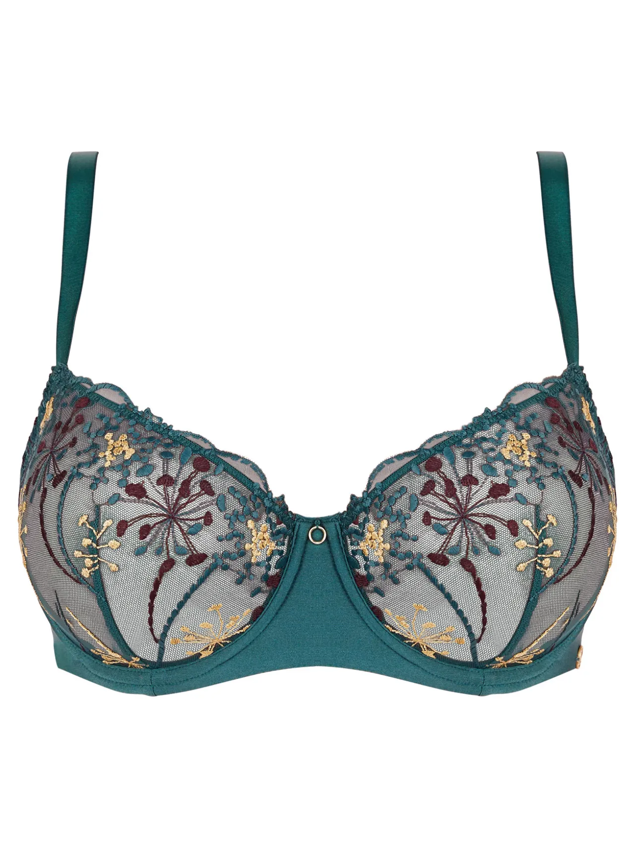 – Les bonnets en broderie florale multicolore avec une touche de lurex ainsi que le bijou doré à l’entre-seins offrent un style féminin des plus séduisants