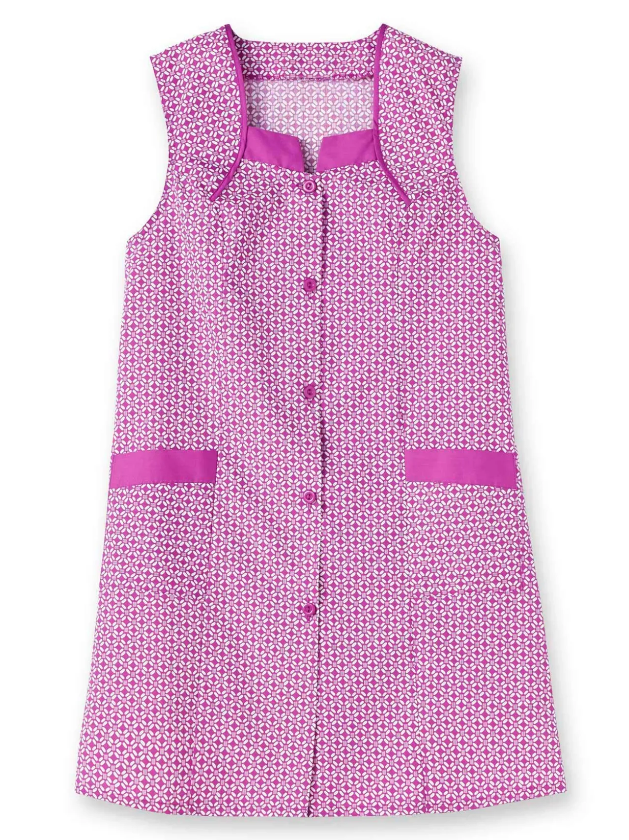 – Encolure et revers des poches contrastants (unis sur tablier imprimé, imprimés sur tablier uni).