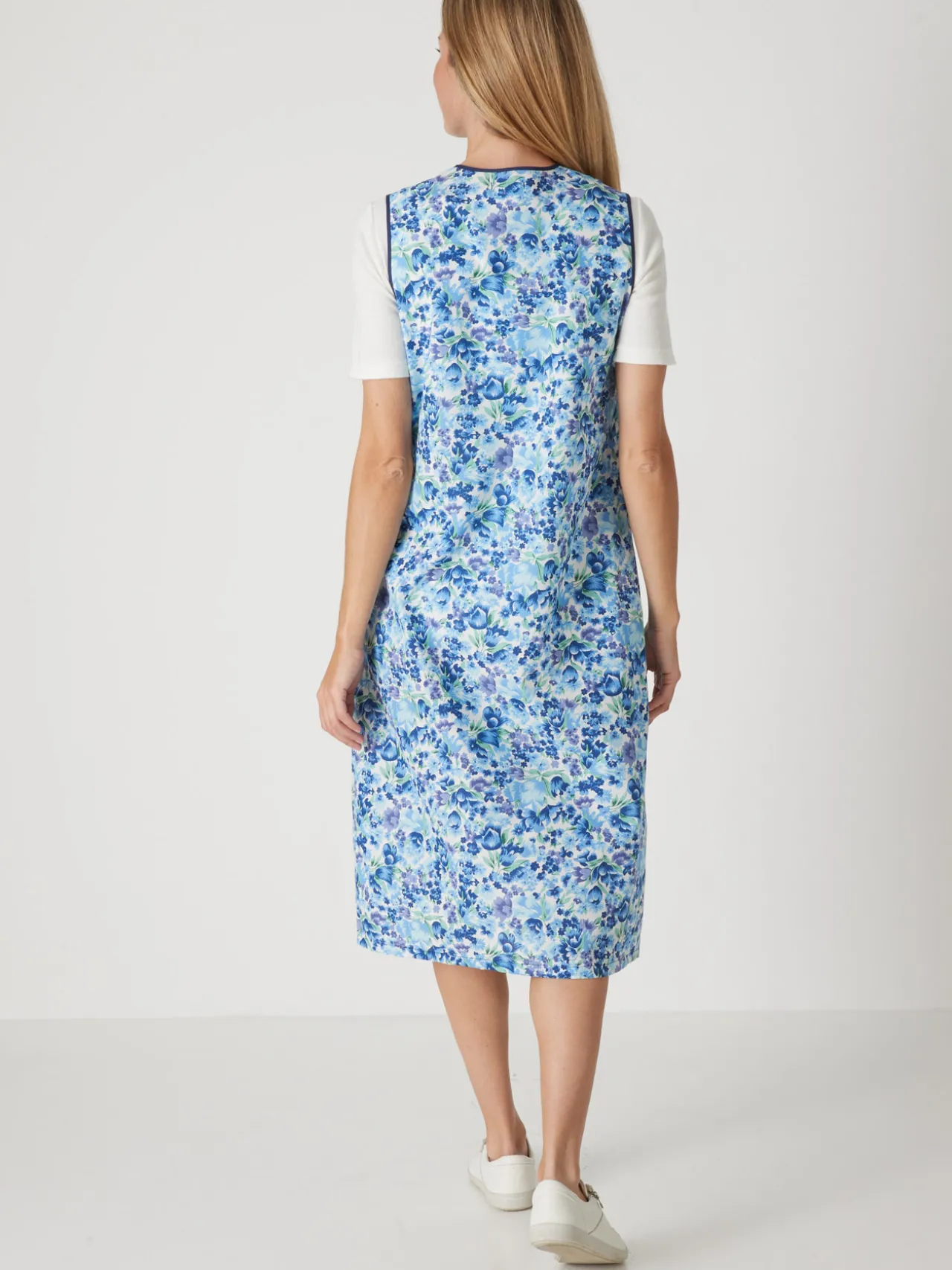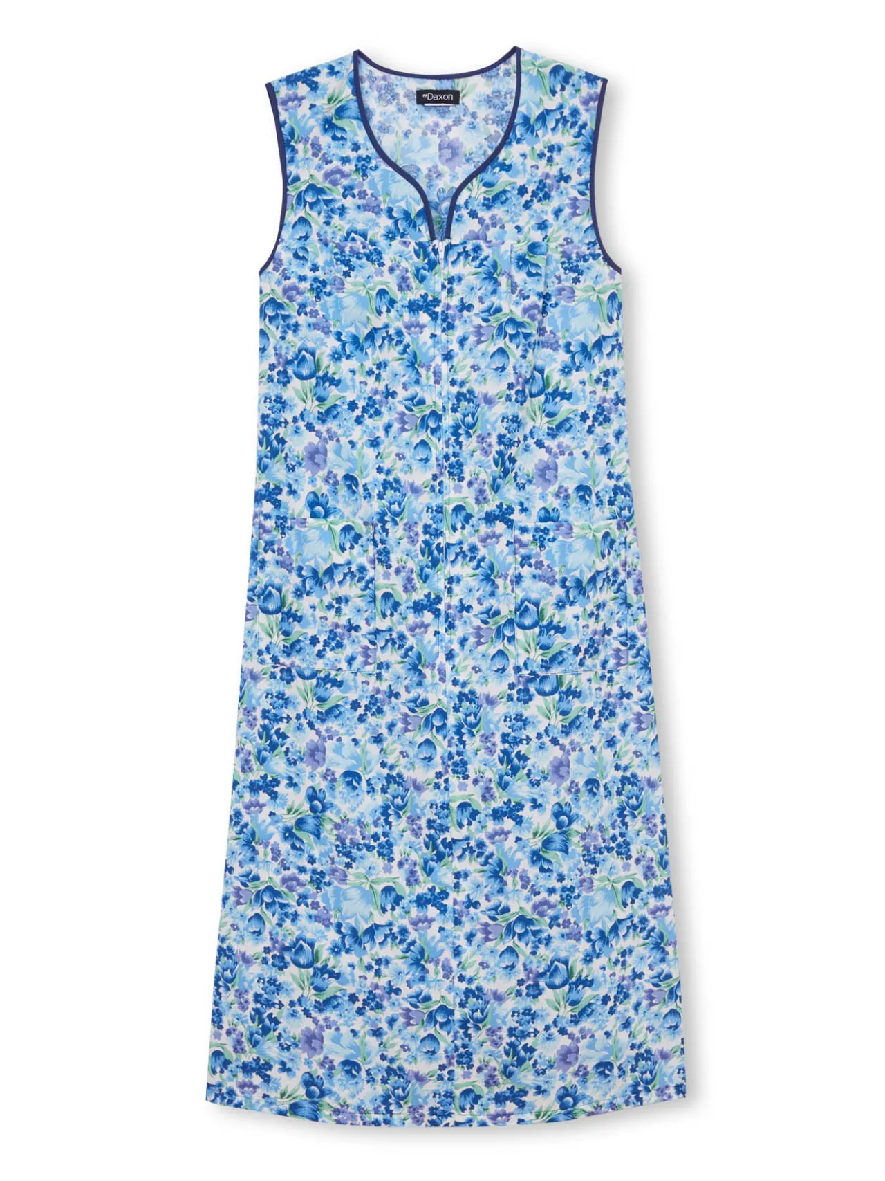 Ganse contrastante à l’encolure coeur et aux emmanchures. Empiècement poitrine avec plis plats. 2 poches plaquées.