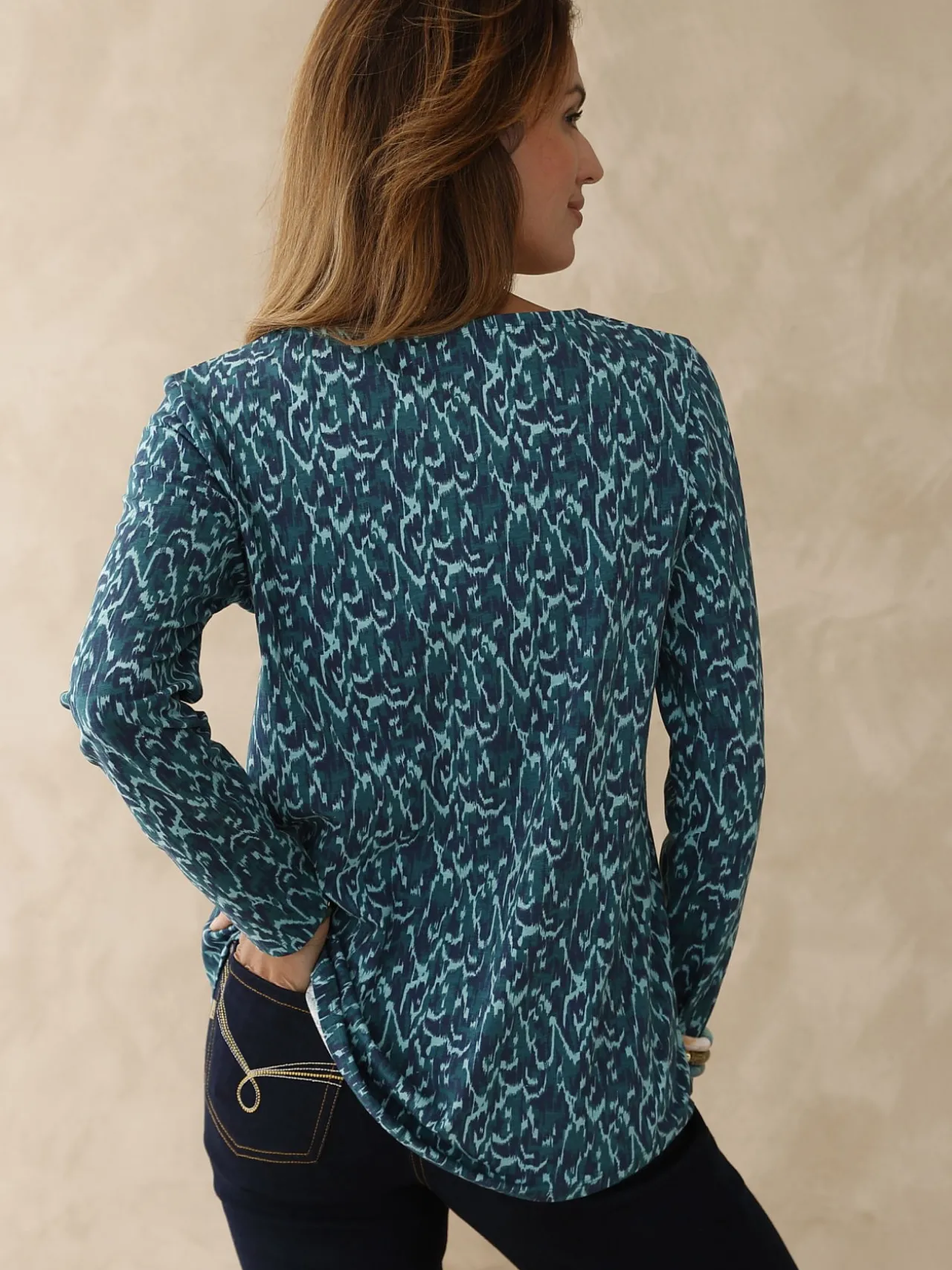 On aime la coupe légèrement évasée et la base arrondie de ce tee-shirt manches longues qui permettent de le porter sur une jupe ou un pantalon, un peu façon tunique. Quant à son imprimé, aux jolies tonalités de bleu, il est juste parfait !