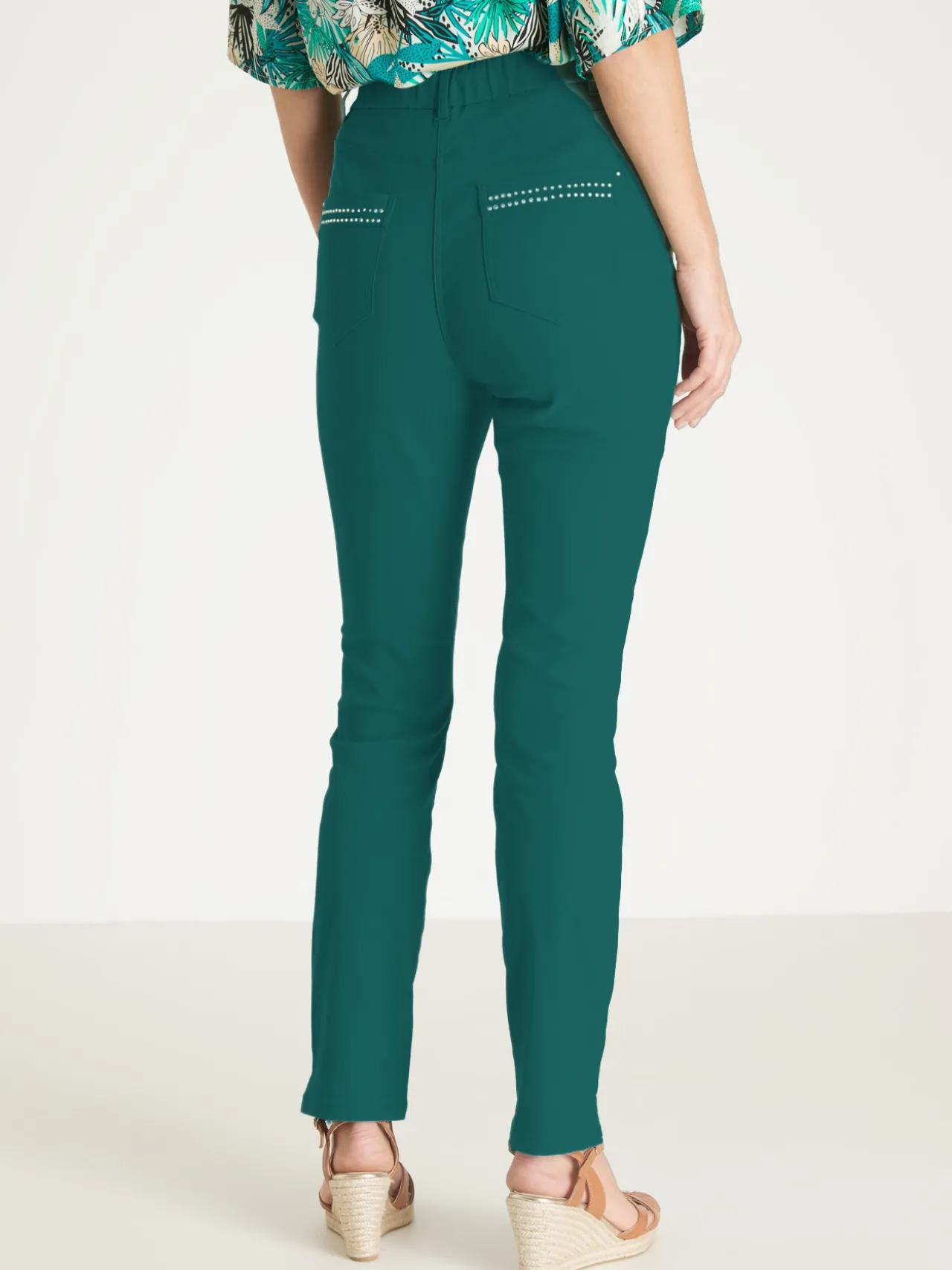 – Poches cavalières devant et poches plaquées au dos soulignées de strass