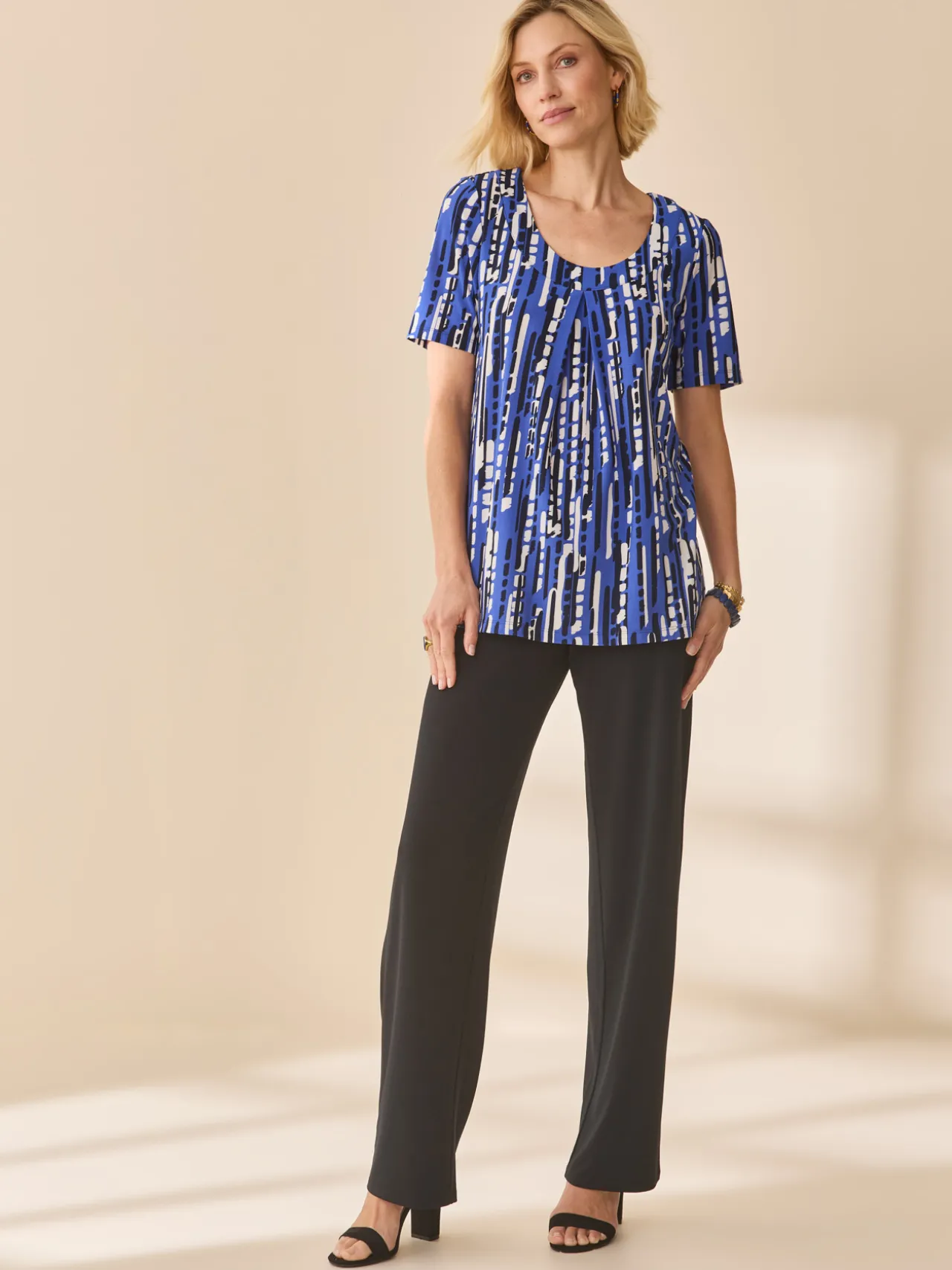 Une tunique manches courtes, que vous jouerez en ensemble avec la jupe imprimée assortie ou la jupe ou le pantalon unis coupés dans la même maille crêpe fluide et extensible.