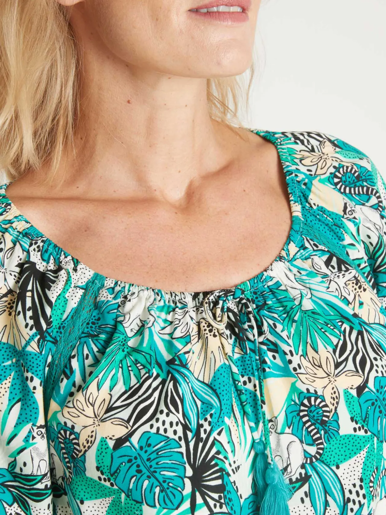 Cette tunique imprimée a choisi un joli galon de dentelle aux emmanchures raglan pour jouer la carte de la fantaisie et du raffinement : effet gagnant ! Grâce à son encolure élastiquée, elle s’enfile facilement.