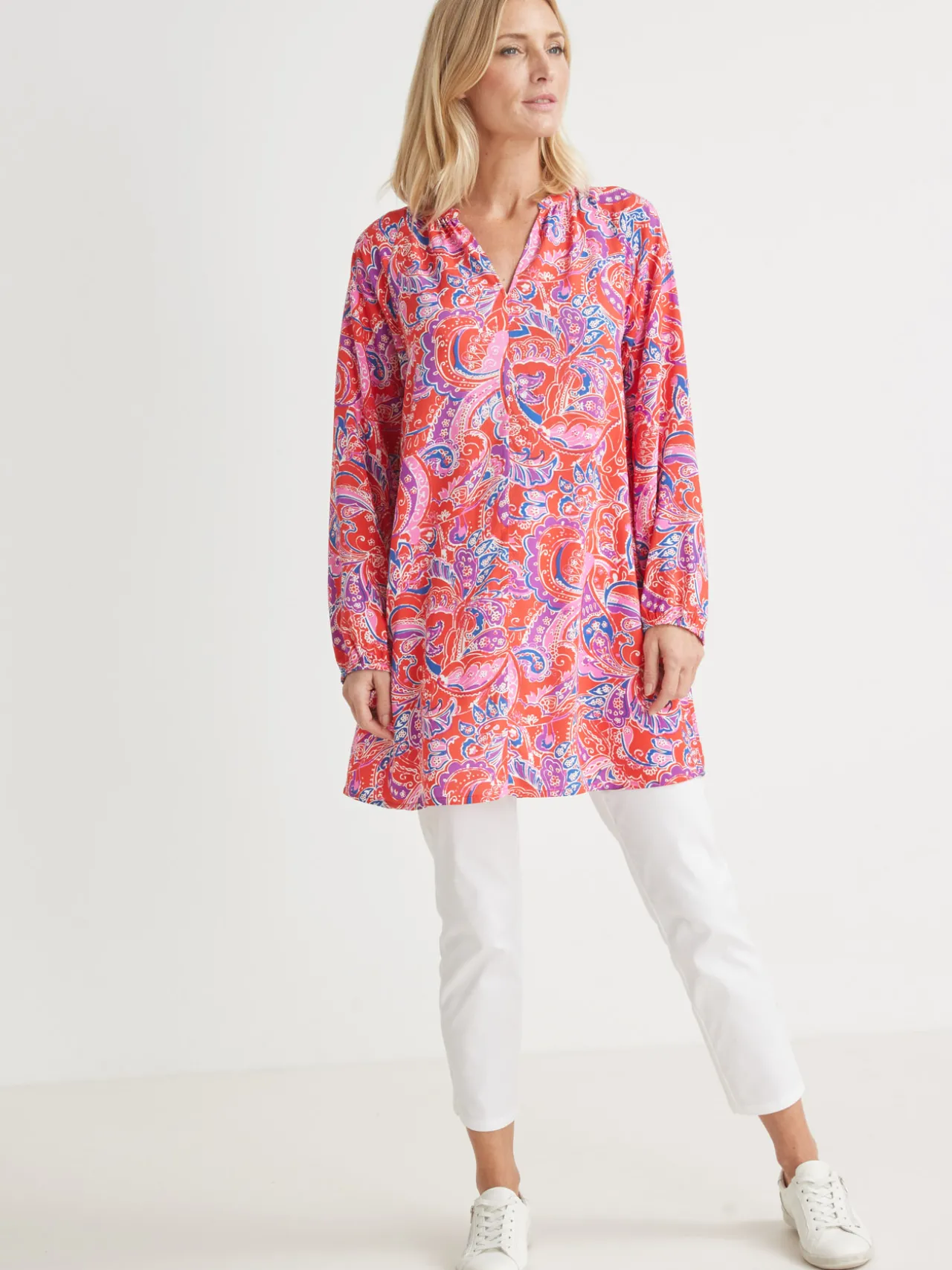 Cette longue tunique est conçue pour s’adapter à toutes les morphologies : petites et grandes tailles.