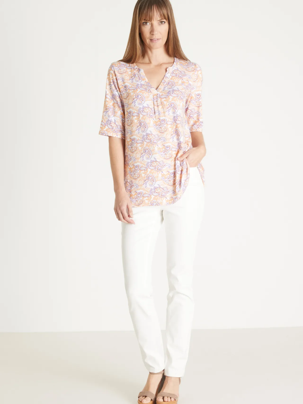 Tunique coupe confortable avec manches aux coudes un peu larges et pli d’aisance sous l’encolure tunisienne devant.
